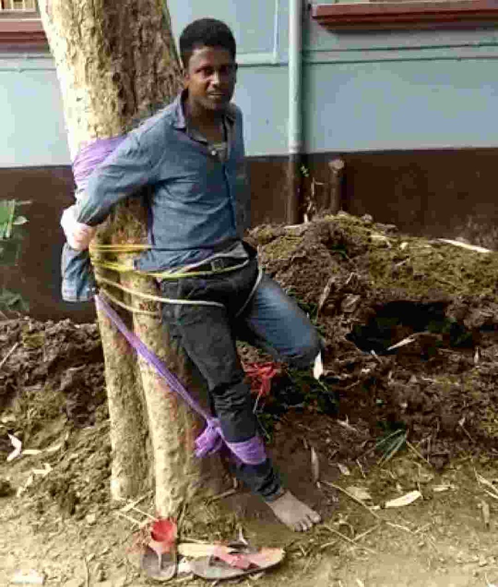 अनोखी सजा: दहेज़ लोभी दामाद को ससुर ने घण्टों पेड़ में बांध कर रखा (देखें वीडियो)