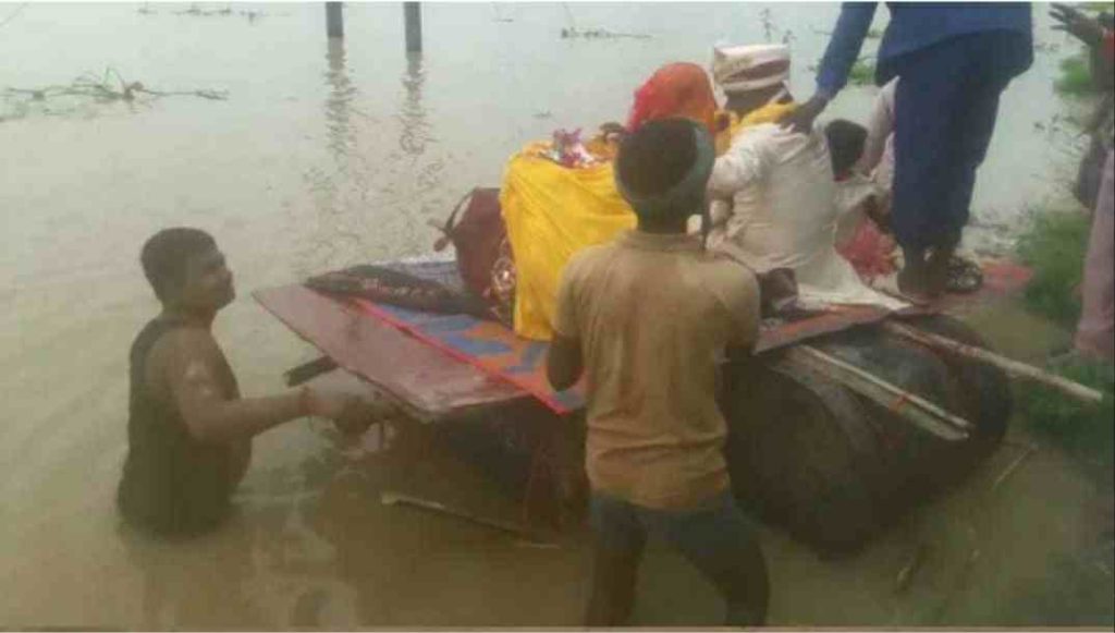 वहीं, बाढ़ से ऐसे हालात हो गए हैं कि लोगों को अपनी बेटियों को जुगाड़ के जरिए विदा करना पड़ रहा है। शुक्रवार रात को एक विवाहित जोड़े का शादी हुई लेकिन अचानक गांव में पानी भरने के बाद विवाहित जोड़े को ड्रम से बने नाव पर बिठा कर विदा करना पड़ा। वैसे तो बेटी डोली में विदा होती है लेकिन बाढ़ ने ऐसा कहर बड़पाया है कि बेटी को ड्रम से बने नाव पर विदा करना पड़ा।