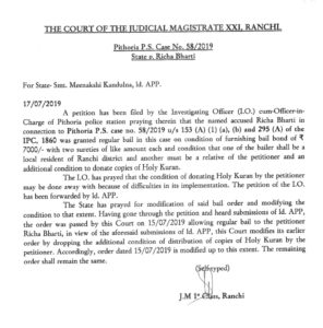 एक छात्रा ऋचा के द्वारा 5 कुरान बांटे जाने का कोर्ट का आदेश तूल पकड़ने लगा। इस बीच आज सम्बंधित कोर्ट ने एक नया आदेश जारी कर कहा कि केस के अनुसन्धान कर्ता के आवेदन पर विचार करते हुए ऋचा की जमानत में लगाए गए सभी शर्त लागू रहेंगे, सिर्फ ऋचा के द्वारा कुरान बांटे जाने का शर्त हटा दिया जाता है।