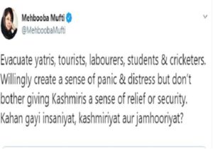 इतना नही महबूबा मुफ्ती ने पीएम मोदी पर निशाना साधते हुए ट्वीट भी किया। उन्होंने कहा, ‘यात्रियों, पर्यटकों, मजदूरों, क्रिकेटरों और छात्रों को कश्मीर से जाने को कहा गया है, कश्मीरियों को राहत देने की कोशिश नहीं की जा रही है। कहां गई इंसानियत, कश्मीरियत और जम्हूरियत?’