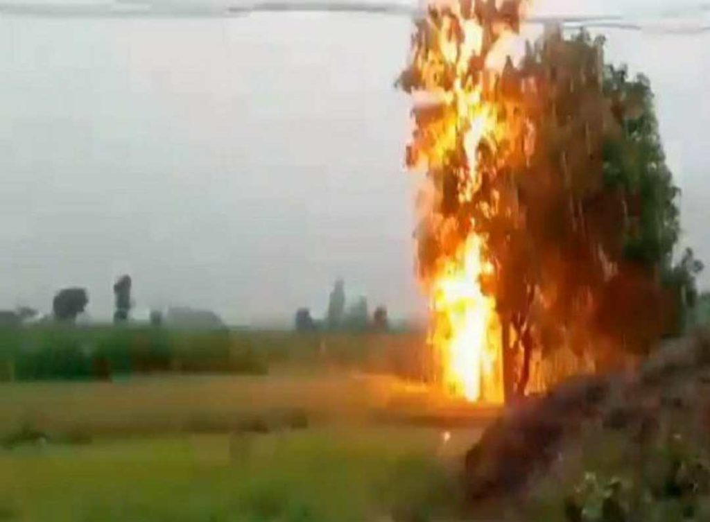 बिजली गिरते ही पेड़ में आग लग गई जिससे पेड़ का काफी हिस्सा झुलस गया है। सोशल मीडिया पर वायरल हो रहे वीडियो में आप देख सकते हैं कि पेड़ से बंधे पशु-मवेशी भी आग देखकर डर जाते हैं और कूदने लगते हैं। हालांकि जानकारी के मुताबिक इस हादसे में किसी की जान नहीं गई है।