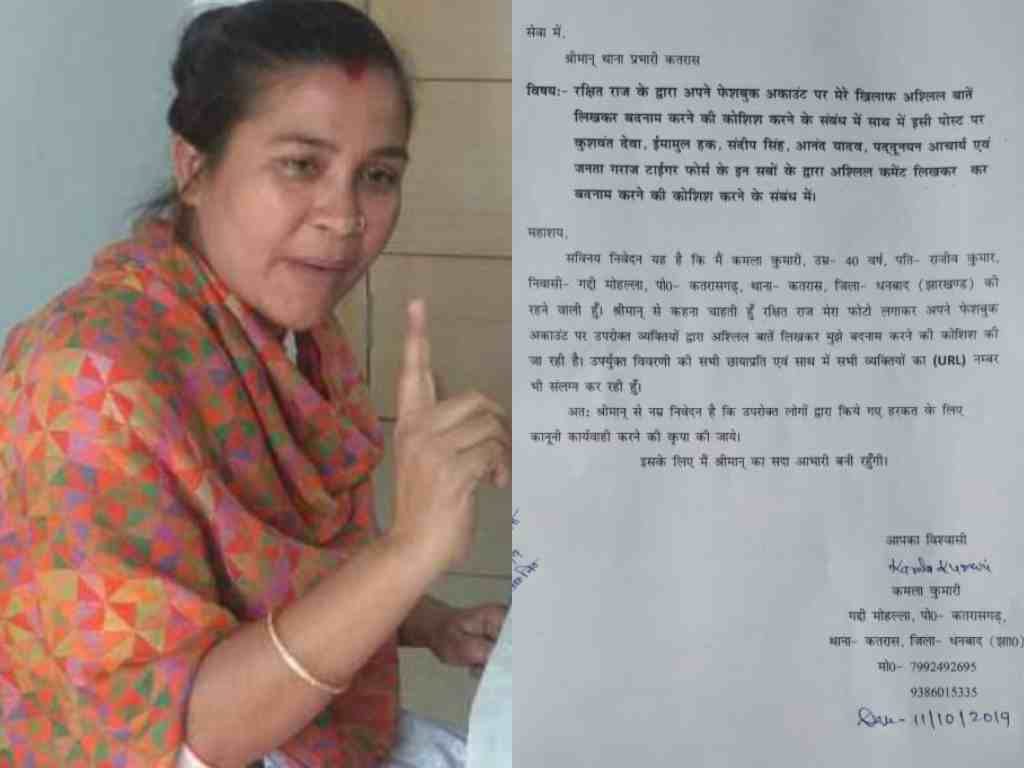भाजपा नेत्री कमला कुमारी ने आज कतरास थाना में लिखित शिकायत देते हुए कहा है कि रक्षित राज ने अपने फेसबुक एकाउंट में मेरा फोटो डाल अश्लील टिप्पणियां की गयी हैं। उस पोस्ट पर अनेकों कमेंट भी हुए हैं जो अश्लील हैं और इस तरह की टिप्पणी कर इनलोगों ने मुझे बदनाम करने की कोशिश की है। कमला कुमारी ने आवेदन में कई लोगों का नाम भी दिया है। यह सही है कि फेस बुक पर किये गए पोस्ट को हम अपने पाठकों के सामने भी नही रख सकते क्योंकि उसमें गन्दी गन्दी बातें लिखी हुई हैं।