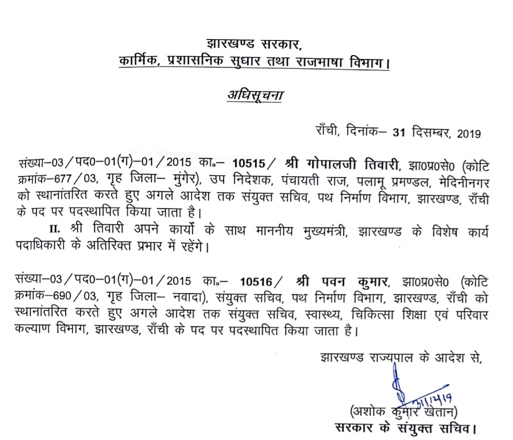 पलामू प्रमंडल मेदिनी नगर में उप निदेशक, पंचायती राज में पदस्थापित गोपाल जी तिवारी को आज मुख्यमंत्री हेमन्त सोरेन का विशेष कार्य पदाधिकारी नियुक्त किया गया है। यही नही श्री तिवारी को पथ निर्माण विभाग, झारखण्ड का संयुक्त सचिव पद की भी जिम्मेवारी दी गयी है। यहां बता दें कि रघुवर सरकार में मुख्यमंत्री के प्रधान सचिव रहे सुनील कुमार वर्णवाल का भी तबादला कर दिया गया था।