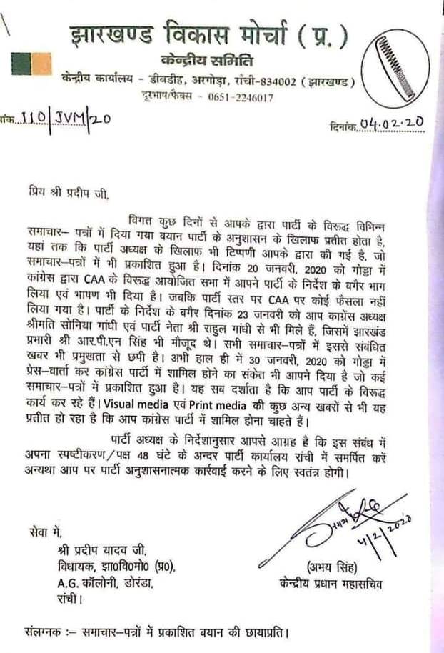 AJ डेस्क: झारखण्ड विकास मोर्चा (जेवीएम) ने अपने दूसरे विधायक प्रदीप यादव को भी आज कारण बताओ नोटिस जारी कर दिया है। उन्हें 48 घंटो के भीतर जवाब देने का निर्देश दिया गया है। स्पष्टीकरण में कांग्रेस से नजदीकियां बढ़ाने, कांग्रेस के शीर्ष नेता सोनिया गांधी और राहुल गांधी से मुलाकात करने और CAA के खिलाफ कांग्रेस द्वारा गोड्डा में हुए विरोध प्रदर्शन में हिस्सा बनने को लेकर जवाब तलब किया गया है।