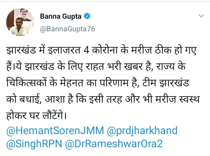 आज झारखण्ड के लिए राहत भरी खबर मिली। झारखण्ड के डॉक्टरों ने कड़ी मेहनत कर कोरोना संक्रमित चार मरीजों को पूर्णतः स्वस्थ कर दिया है। इन मरीजों का पुनः जाँच भी कराया गया। जाँच रिपोर्ट नेगेटिव आया है। झारखंड में सबसे पहले कोरोना संक्रमित पाई गई पहली मरीज मलेशियाई युवती के अलावा हजारीबाग के दो व सिमडेगा के एक मरीज ठीक हो गए हैं। मंत्री बन्ना गुप्ता ने टीम झारखण्ड को बधाई देते हुए आशा व्यक्त किया है कि इसी तरह और भी मरीज स्वस्थ होकर घर लौटेंगे।