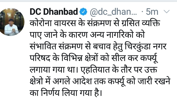 धनबाद के चिरकुंडा थाना क्षेत्र में जिला का पहला कोरोना संक्रमित मरीज मिलने के बाद थाना क्षेत्र के विभिन्न क्षेत्रों में 16 अप्रेल की मध्य रात्रि से कर्फ्यू अगले आदेश तक बदस्तूर जारी रखने का एलान जिला प्रशासन ने किया है। इस संबंध में अनुमंडल दंडाधिकारी राज महेश्वरम ने कहा कि लोगों की सुरक्षा को ध्यान में रखते हुए 30 अप्रैल 2020 की मध्य रात्रि से कर्फ्यू को समाप्त करने के लिए गए आदेश को निरस्त कर दिया गया है। कर्फ्यू के दौरान वहां की जनता का सकारात्मक सहयोग प्राप्त हो रहा है।