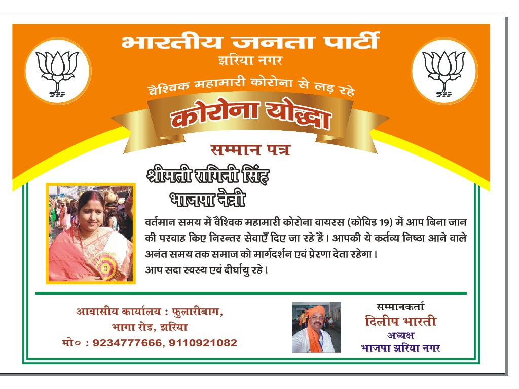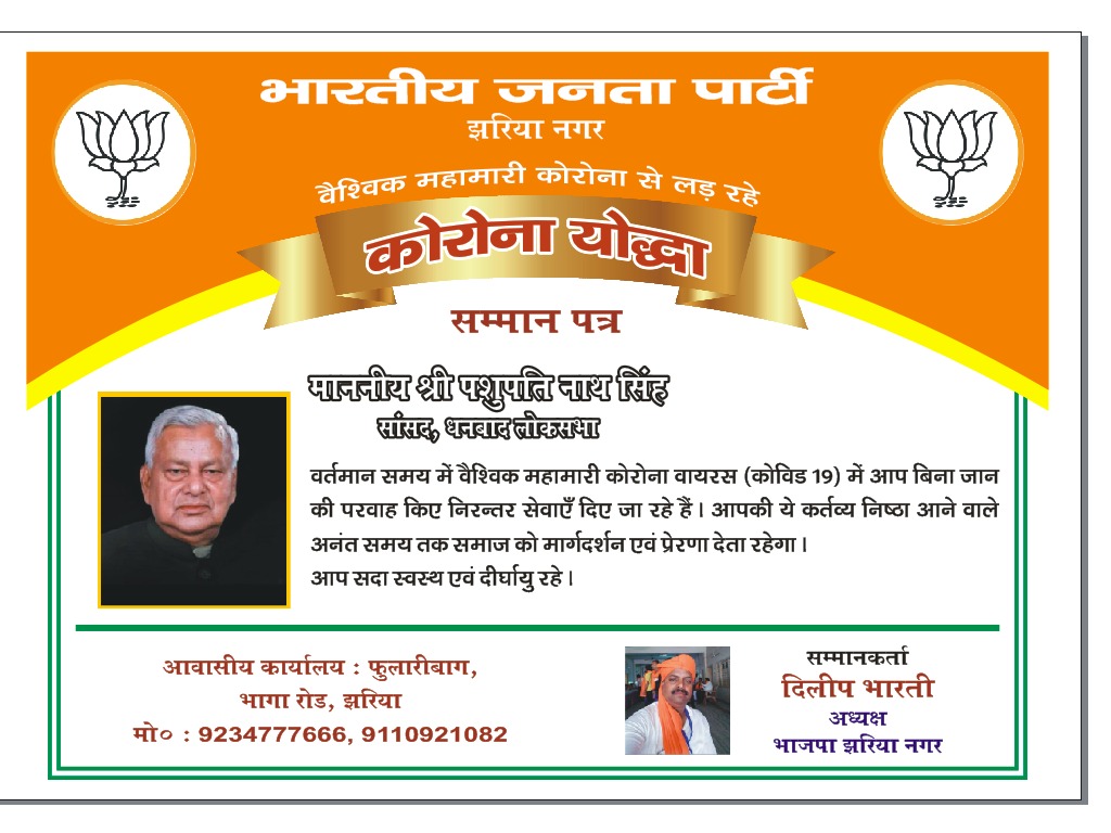 AJ डेस्क: धनबाद के झरिया स्थित बिहार बिल्डिंग में चल रहे मोदी आहार कार्यक्रम का समापन बुधवार को हो गया। इस दौरान कोरोना योद्धा के रूप में सांसद पशुपति नाथ सिंह और भाजपा नेत्री रागिनी सिंह को पत्र देकर सम्मानित किया गया। इस मौके पर सांसद पशुपतिनाथ सिंह ने कह कि इस कोरोना काल में लगातार मोदी आहार वितरित किया जा रहा है। जिससे भाजपा कार्यकर्ताओं ने ये साबित कर दिया है कि यहां के सभी भाजपा कार्यकर्ता कोरोना काल के योद्धा हैं, जो हर समय लोगों की सेवा के लिए तत्पर रहते हैं।