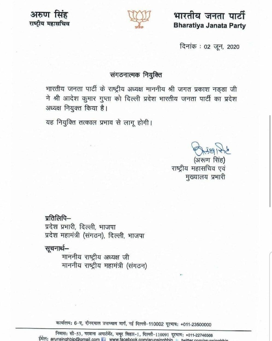 मनोज तिवारी गए, दिल्ली भाजपा के नए अध्यक्ष बने आदेश कुमार गुप्ता