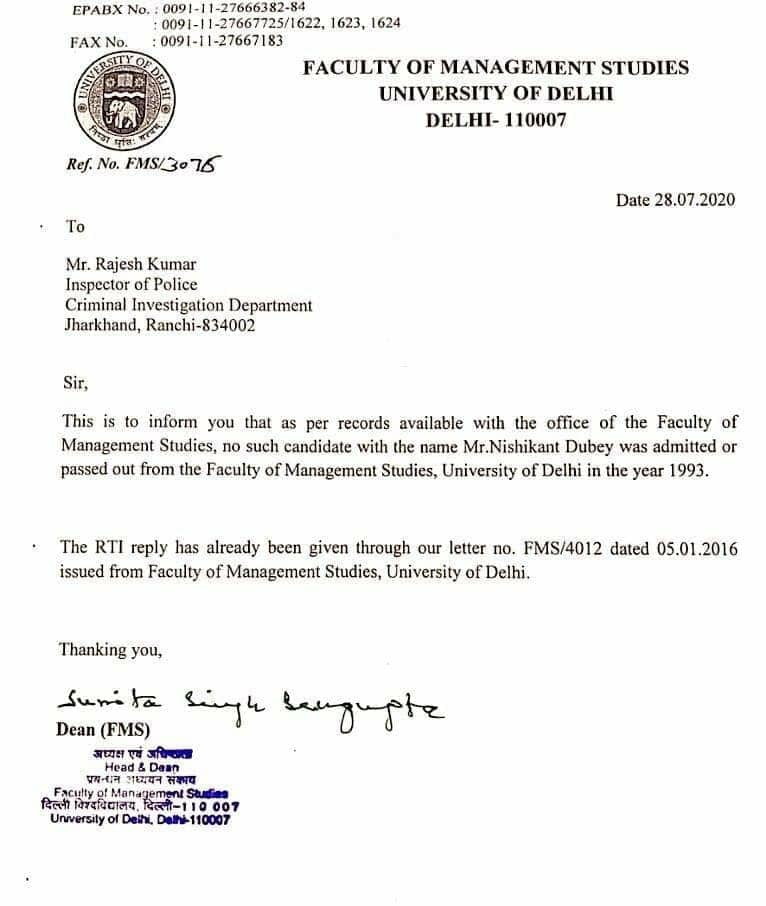 सोशल मीडिया पर वायरल हो रहे इस ताजा पत्र में दिल्ली यूनिवर्सिटी फैकल्टी ऑफ मैनेजमेंट स्ट्डीज के लेटर पैड पर झारखंड पुलिस को संबोधित करते हुए मजमून लिखा है।पत्र में लिखा गया है कि दिल्ली विश्वविद्यालय से 1993 में निशिकांत दुबे नाम के किसी भी व्यक्ति ने पार्ट टाइम एमबीए की डिग्री हासिल नहीं की है। दिल्ली विश्वविद्यालय ने इस संबंध में झारखंड पुलिस को भी कार्रवाई के लिए पत्र लिखा है।