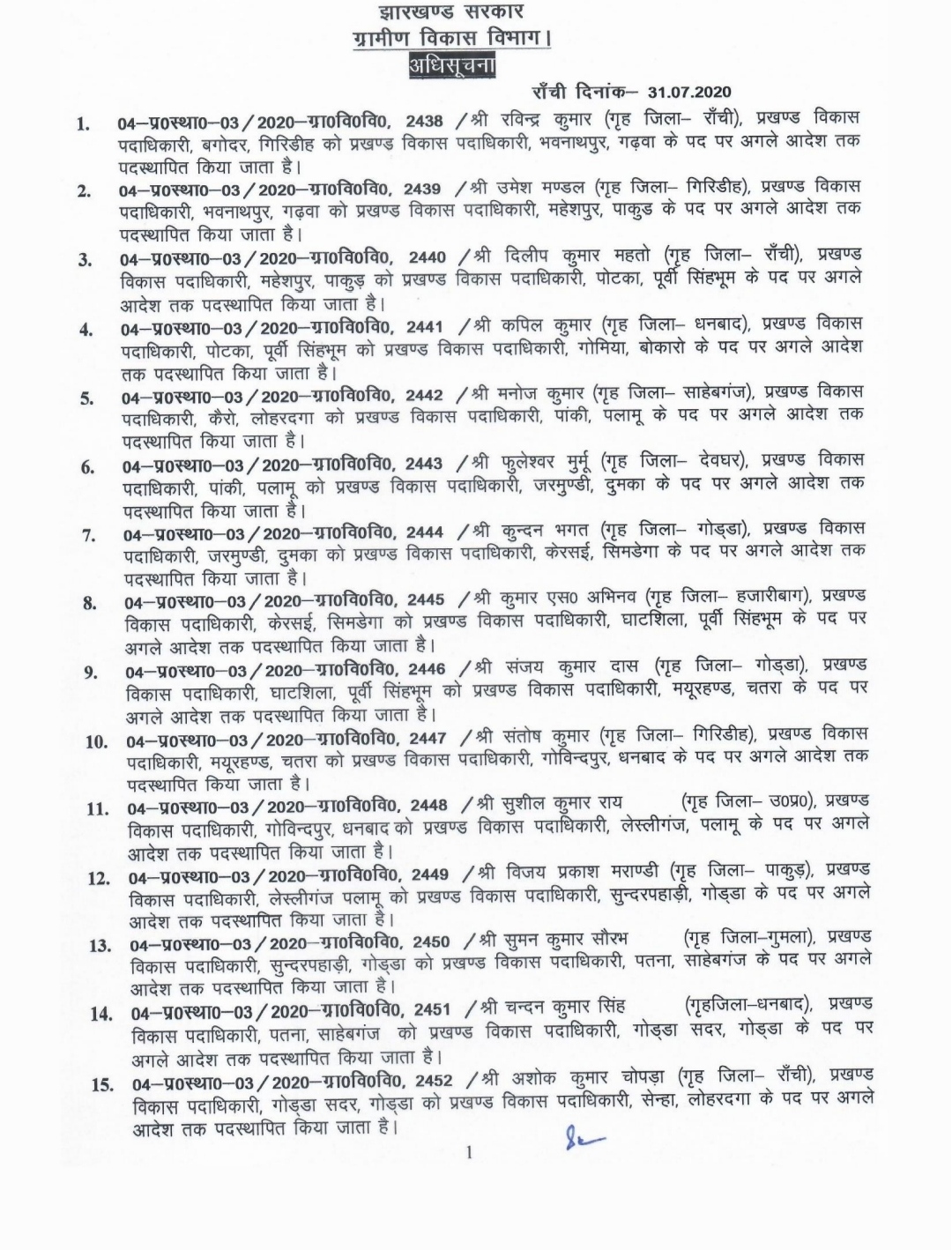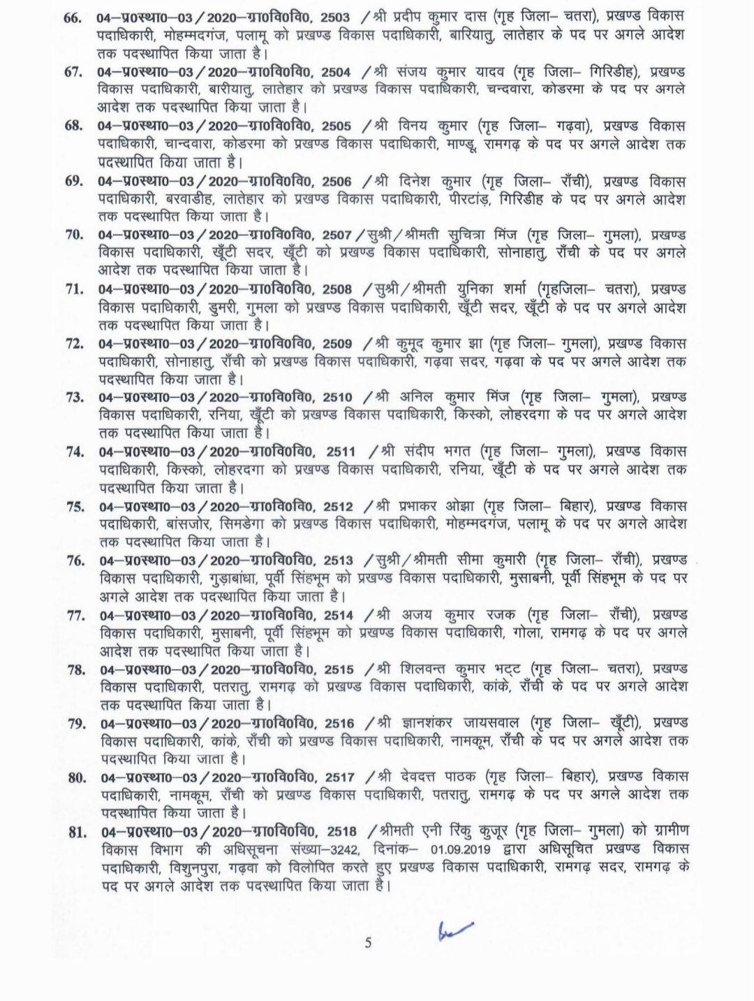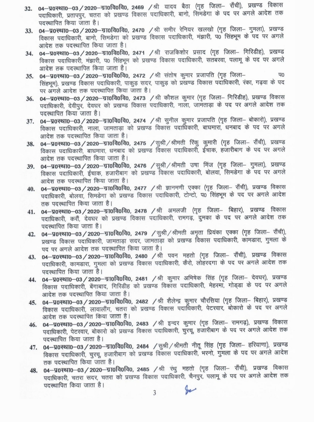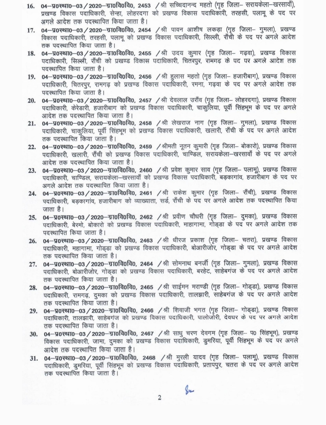 AJ डेस्क: झारखंड सरकार ने राज्य के 90 बीडीओ को इधर से उधर कर दिया है। शुक्रवार को ग्रामीण विकास विभाग से जारी इस अधिसूचना के अनुसार अब बाघमारा के बीडीओ सुनील कुमार प्रजापति होंगे, जबकि बाघमारा के निवर्तमान बीडीओ रिंकू कुमारी को इचाक हजारीबाग तबादला कर दिया गया है। इसी तरह संतोष कुमार गोविंदपुर के नए बीडीओ बनाए गए है, जबकि गोविंदपुर के निवर्तमान बीडीओ सुशील कुमार राय को लेस्लीगंज भेज दिया गया है।