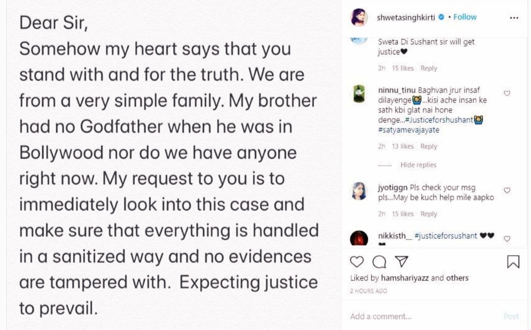 अपने खुले पत्र में श्वेता सिंह कीर्ति ने लिखा, ‘प्रिय महोदय, मेरा दिल कहता है कि आप सच्चाई के साथ खड़े हैं और हम बहुत ही साधारण परिवार से हैं। मेरे भाई का बॉलीवुड में कोई गॉडफादर नहीं था और न ही हमारे पास अभी कोई है। आपसे मेरा अनुरोध है कि आप तुरंत इस मामले को देखें और सुनिश्चित करें कि सब कुछ एक सही तरीके से संभाला जाए और किसी भी सबूत के साथ छेड़छाड़ न की जाए। न्याय की जीत की उम्मीद है।’