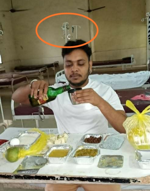 इस तस्वीर पर अगर ध्यान दें तो इस शख्स के ठीक पीछे सलाइन चढ़ाने वाले स्टेंड पर दो और हथकड़ियां लटक रही है, उसे पास वाला बेड भी किसी मरीज के लिए तैयार नजर आ रहा है, लेकिन उस बेड पर कोई दिखाई नही दे रहा। जबकि एक हथकड़ी इस अपराधी के हाथों में लटक रहा है। इससे यह प्रतीत होता है कि इस वार्ड में अपराध से जुड़े कोरोना मरीजों को ही रखा जाता है। पर इसके अलावा भी इस वार्ड में कोई है जो इसकी इस हरकत की तस्वीरें निकाल रहा है। अब वो कोई यहाँ भर्ती कोरोना का मरीज, अस्पताल कर्मचारी है या पुलिसकर्मी है यह तो जांच का विषय है। लेकिन हां इतना जरूर है इसके साथ जो भी शख्स मौजूद है वो इसे यह सब करने में मदद जरूर कर रहा है। साथ ही पुलिस के निगरानी में यहाँ इलाजरत इस अपराधी को दारू और दावत उड़ाने के लिए इतने पकवान कहाँ से और किसने उपलब्ध कराए यह भी बड़ा सवाल है।