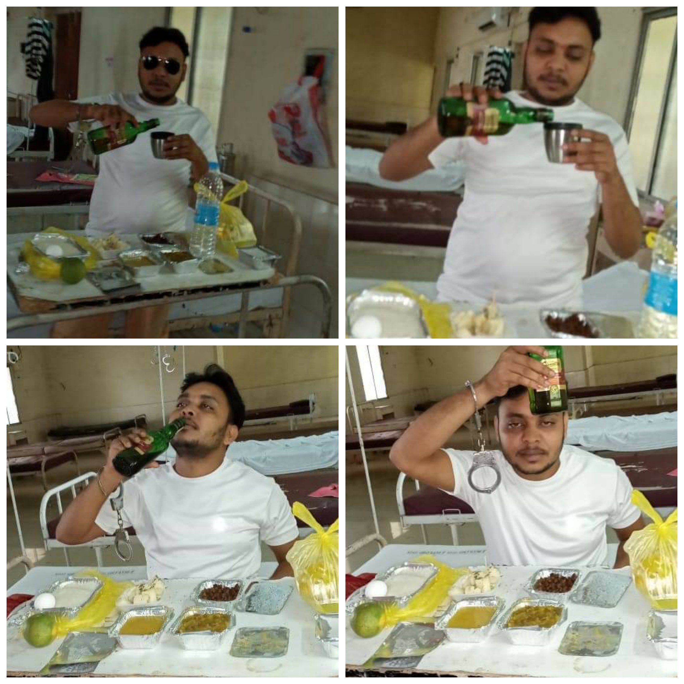 सोशल मीडिया पर वायरल इसके चौंका देने वाली इन तस्वीरों पर गौर करे तो यह कोरोना संक्रमित इलाजरत अपराधी अपने बेड के आगे लगे एक मेज के सामने बैठा है। इसके मेज पर दावत की सारी चीजें रखी है और यह हथकड़ी लगे हाथों से एक तस्वीर में अपने ग्लास में महंगी शराब परोसता दिखाई दे रहा है तो दूसरी तस्वीर में इसने शराब को अपने सर के पास उठा बड़े ही गर्व से तस्वीरें खिंचाता नजर आ रहा है। मानो यह किसी ‘बार एंड रेस्टोरेंट’ में बैठ कर पार्टी मना रहा हो।