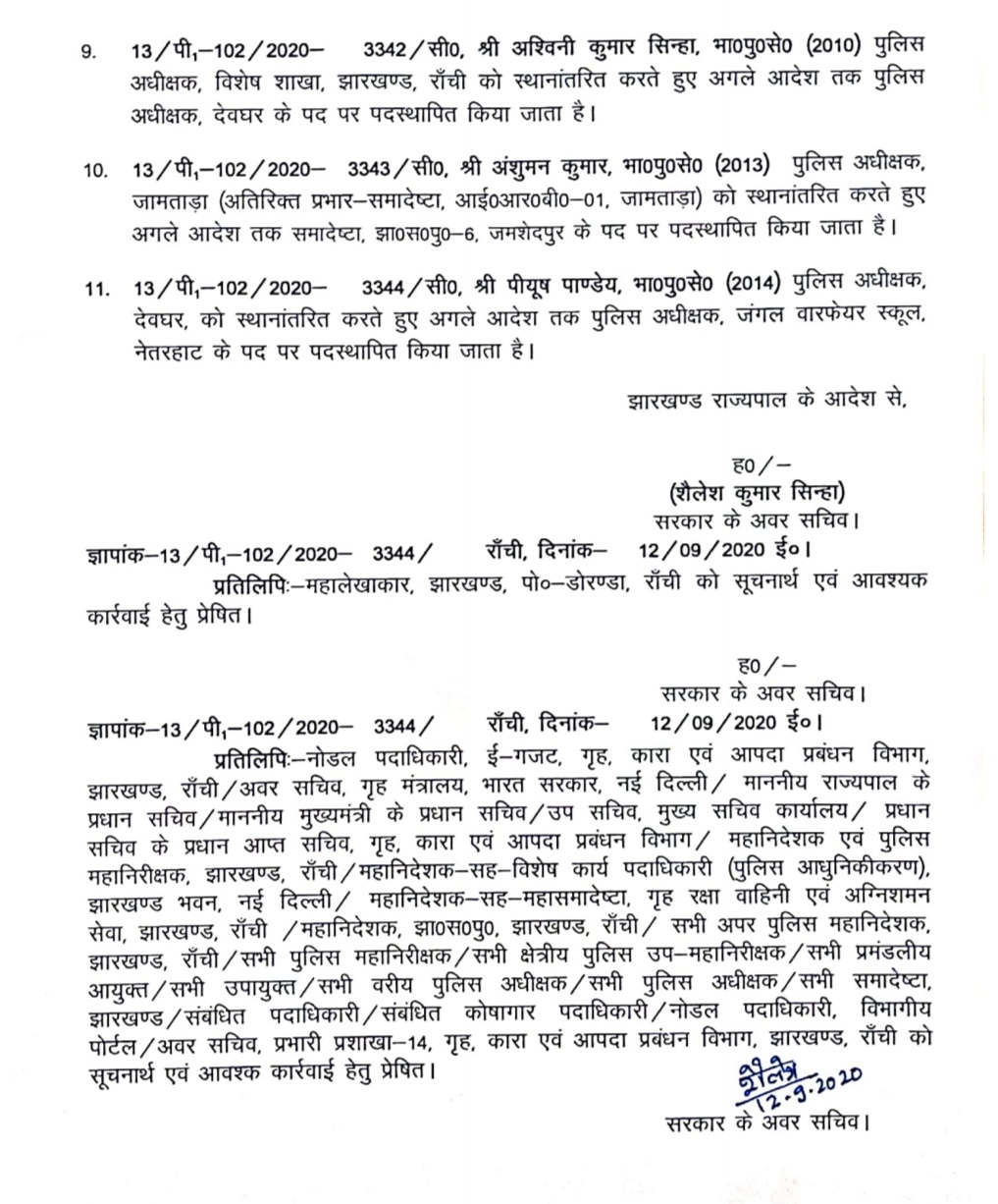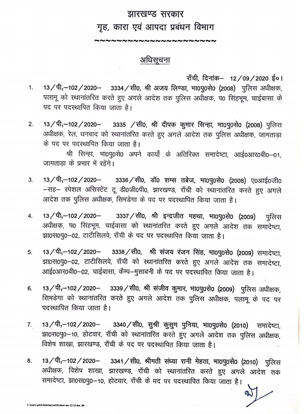 झारखण्ड में 11 IPS का तबादला, धनबाद रेल एस पी बदले गए