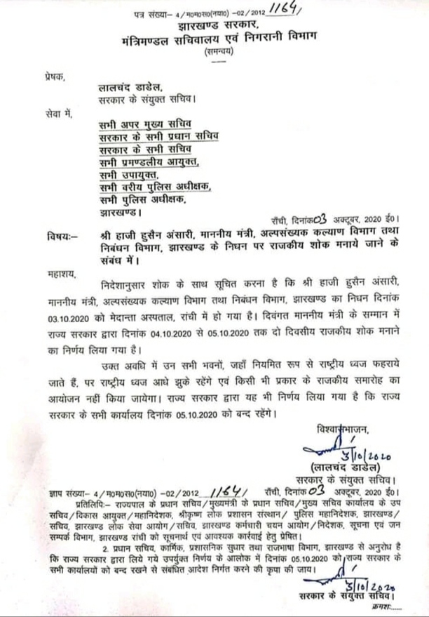 AJ डेस्क: झारखंड सरकार ने अल्पसंख्यक कल्याण मंत्री हाजी हुसैन अंसारी के निधन पर राज्य में दो दिनों के राजकीय शोक की घोषणा की है और इस दौरान राज्य में सभी सरकारी भवनों पर राष्ट्रीय ध्वज आधा झुका रहेगा तथा सोमवार को राज्य में अवकाश रहेगा। इस बाबत झारखंड सरकार के मंत्रिमंडल सचिवालय एवं निगरानी विभाग (समन्वय) ने एक पत्र जारी कर इसकी जानकारी दी है।