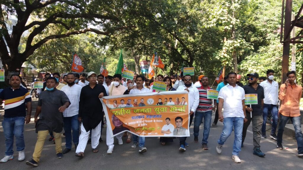 AJ डेस्क: झारखंड में बढ़ते अपराध और रेप व लूट जैसी घटनाओं आह्त भाजयुमो की ओर से धनबाद के सिटी सेंटर से रणधीर वर्मा चौक तक शुक्रवार को पैदल यात्रा निकाल कर वर्तमान सरकार की नीतियों का विरोध किया गया। इस दौरा भाजपा व भाजयुमो के कार्यकर्ता हाथों में तख्तियां लिए हुए थे। भाजयुमो कार्यकर्ताओं ने इस दौरान राज्य सरकार के खिलाफ जमकर नारेबाजी भी की। पैदल या़त्रा के बाद विधायक राज सिन्हा ने रणधीर वर्मा चैक पर एक आम सभा को संबोधित भी किया।