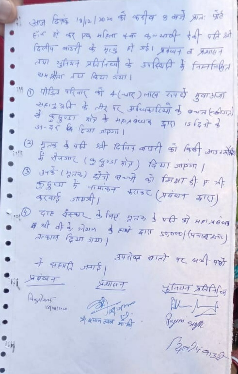 भाजपा नेत्री रागिनी के प्रयास से पीड़ित परिवार को 4 लाख मुआवजा व नियोजन पर सहमति