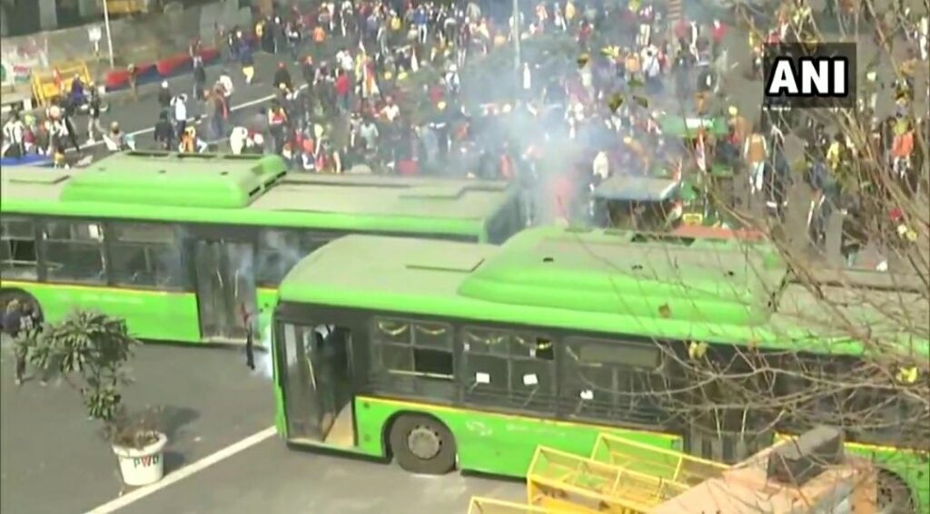 DTC bus vandalised by protesting farmers at ITO in central Delhi pic.twitter.com/ABxOkzlyjH