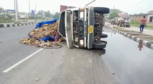 जी टी रोड पर मवेशियों की हड्डी से भरा ट्रक पलटा, चालक से पुलिस कर रही पूछताछ