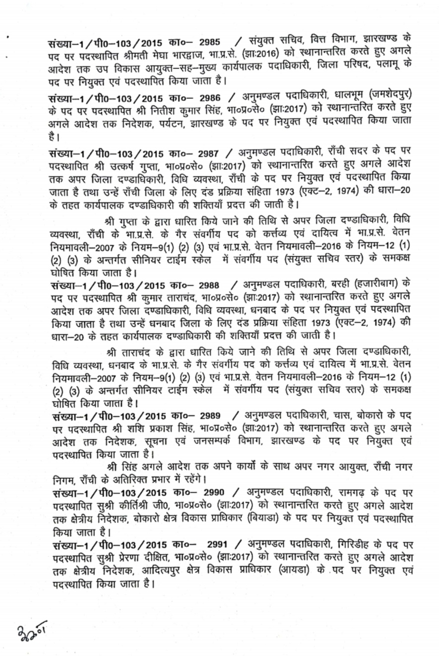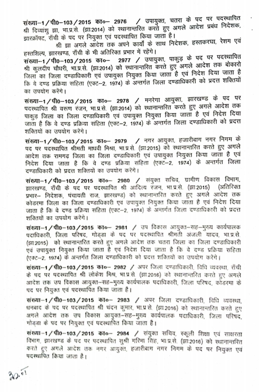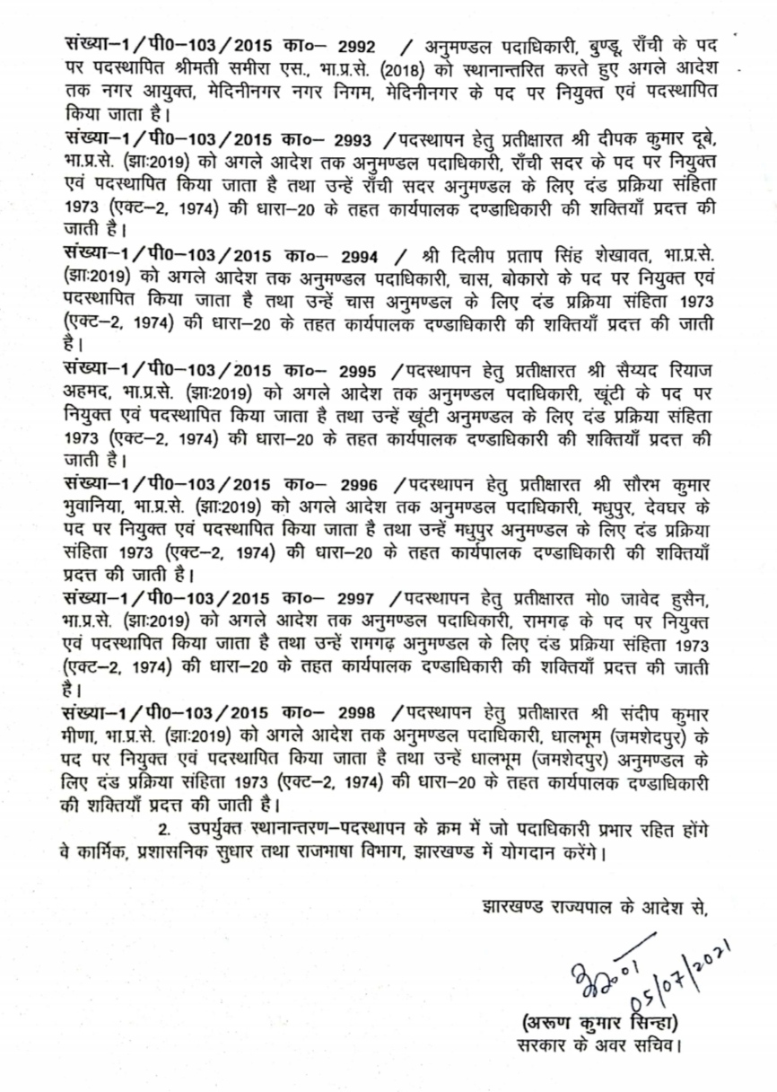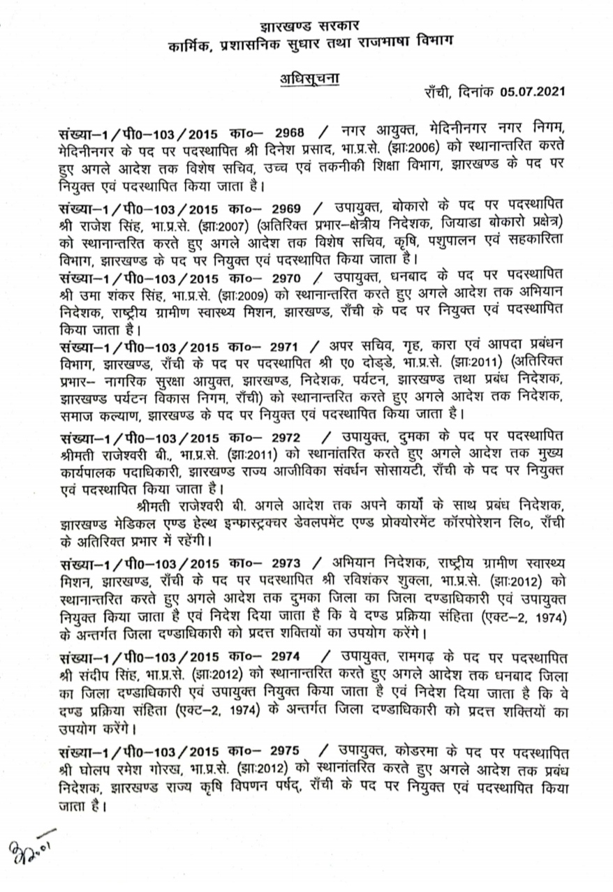 AJ डेस्क: राज्य सरकार ने आज 37 अधिकारियों का इधर से उधर तबादला किया है। धनबाद के उपायुक्त उमा शंकर सिंह ग्रामीण स्वास्थ्य मिशन के निदेशक बनाए गए हैं तो वहीं रामगढ़ के DC संदीप सिंह को धनबाद का उपायुक्त बनाया गया है। बरही के अनुमंडल पदाधिकारी कुमार ताराचंद को धनबाद का अपर जिला दंडाधिकारी (विधि व्यवस्था) बनाया गया है। बोकारो DC का कमान अब पाकुड़ के DC कुलदीप चौधरी के हाथों सौंपा गया है।