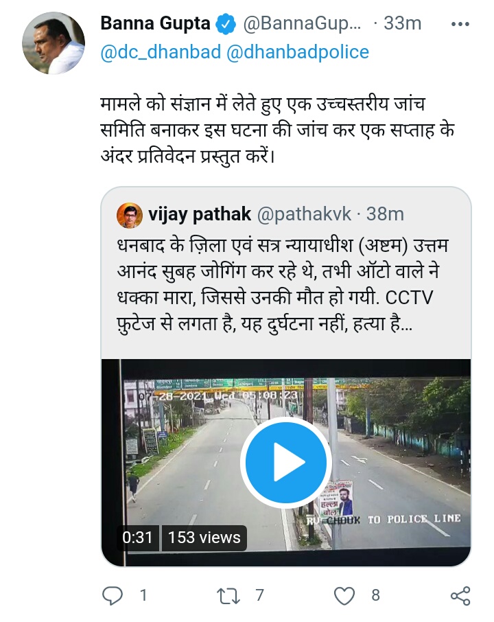 यह सीसीटीवी फुटेज कई सवालों के साथ हत्या की आशंका को भी बल देता नजर आ रहा है। इस पूरे मामले पर झारखंड के स्वास्थ्य मंत्री बन्ना गुप्ता ने धनबाद डीसी एवं धनबाद पुलिस को ट्वीट कर इस मामले में उच्च स्तरीय जांच समिति बनाकर इस घटना की जांच कर एक सप्ताह के अंदर जांच रिपोर्ट देने का निर्देश दिया है।