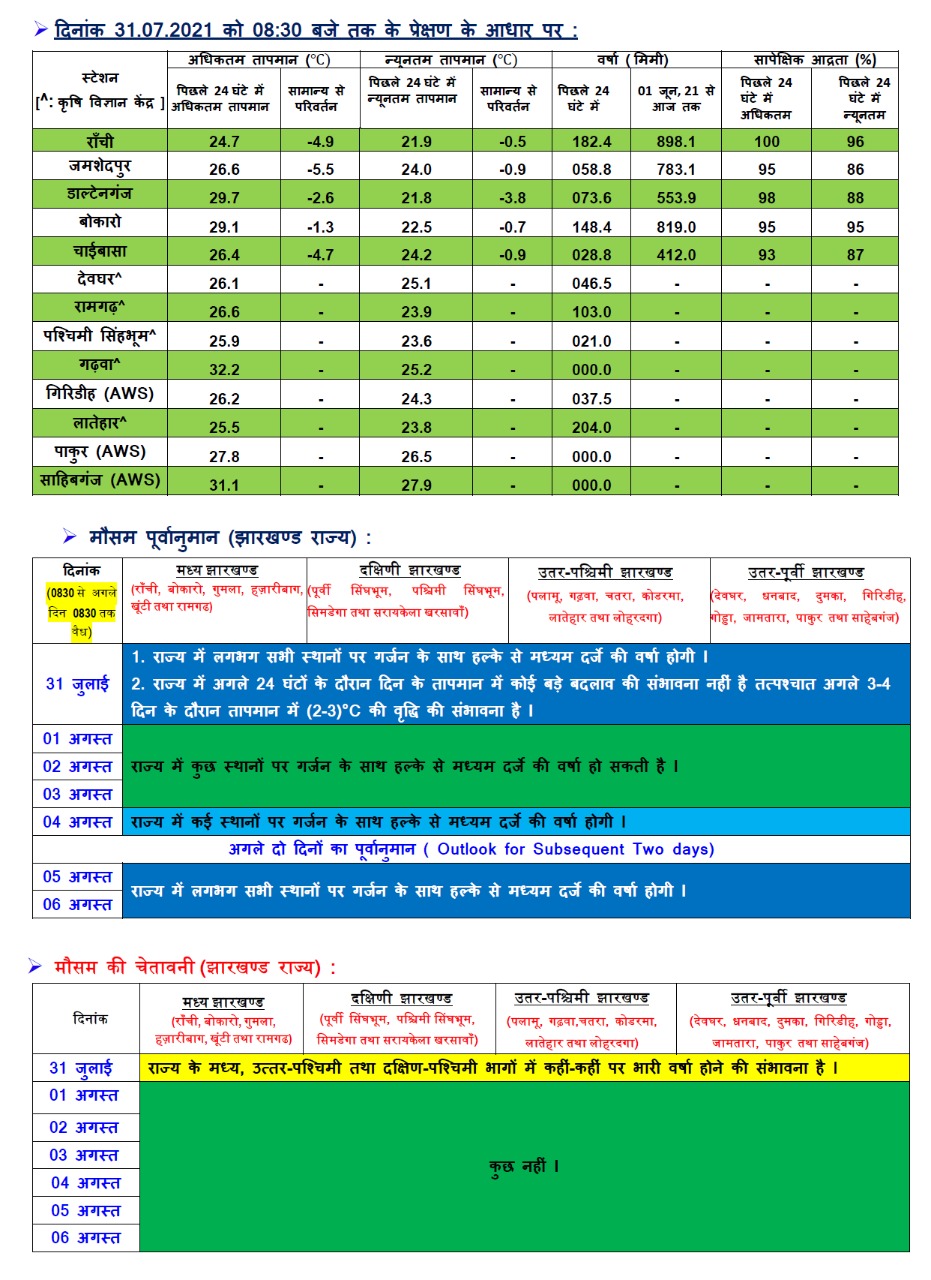 मौसम विभाग के पूर्वानुमान के मुताबिक शनिवार को झारखण्ड के कई जिलों में बारिश होने की संभावना है। मौसम विभाग के पूर्वानुमान में कहा गया है कि 1 से 4 अगस्त तक राज्य के कुछ जिलों में हल्के मध्यम दर्जा की बारिश हो सकती है। यह सिलसिला 6 अगस्त तक जारी रहेगा।