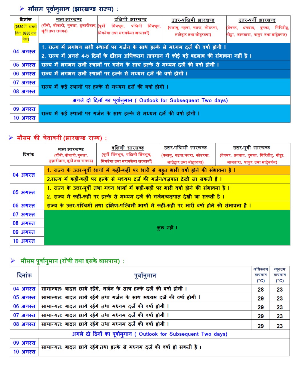 AJ डेस्क: रांची स्थित मौसम विभाग ने पूर्वानुमान जारी करते हुए कहा है कि राज्य के उत्तर पूर्वी हिस्से के धनबाद, गिरिडीह, देवघर, जामताड़ा, दुमका, गोड्डा और साहिबगंज जिला के कुछ हिस्से में आज और 5 अगस्त को भारी बारिश होने की संभावना है। मौसम विभाग ने यह भी कहा है कि इसके अलावा अन्य जिलों में भी हल्के मध्यम दर्जे की बारिश होगी।