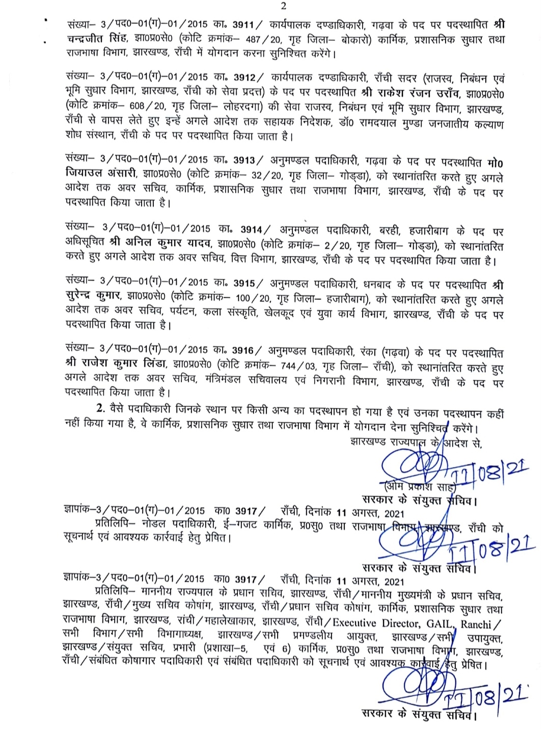 AJ डेस्क: राज्य सरकार ने आज अनेकों पदाधिकारियों का इधर से उधर तबादला किया है। धनबाद में SDM रहे सुरेंद्र कुमार हाल ही में छात्राओं पर लाठी चार्ज किए जाने की घटना को लेकर विवाद में फंस गए थे। आज SDM सुरेंद्र कुमार का तबादला रांची के पर्यटन, कला संस्कृति, खेल कूद एवम युवा कार्य विभाग के अवर सचिव के रूप में हो गया है। जबकि रांची से प्रेम कुमार तिवारी का धनबाद SDM के पद पर पोस्टिंग हुआ है।