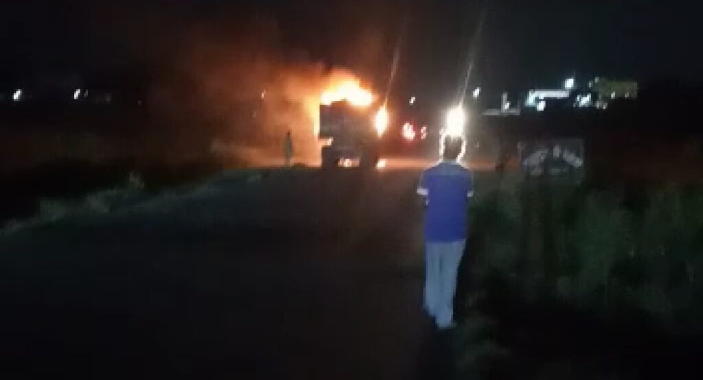 सरपट दौड़ रही हाइवा में लगी आग, धु धु जल रहे वाहन से ड्राइवर और खलासी ने कूदकर बचाई जान