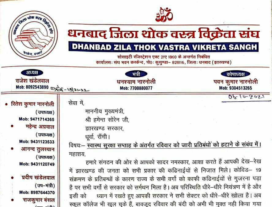 संघ के महासचिव घनश्याम नारनोली ने बताया कि झारखंड में इस वक्त कोरोना अपने न्यूनतम स्तर पर है। अब तो स्कूल, सरकारी दफ्तर भी पूरी तरह खोले जा चुके है, बावजूद इसके अभी तक रविवार को बन्दी मुक्त नही किया गया है। कोरोना काल मे व्यवसाइयों को काफी नुकसान उठाना पड़ा है। अब दुर्गा पूजा, दीपावली, छठ, आदि त्योहार के समय रविवार की बन्दी न्यायोचित नही है। रविवार की बन्दी के कारण शनिवार को बाज़ारो में भीड़ का भार ज्यादा हो जाता है। अतः हम माननीय से आग्रह करते है कि रविवार को बंद मुक्त किया जाए।
