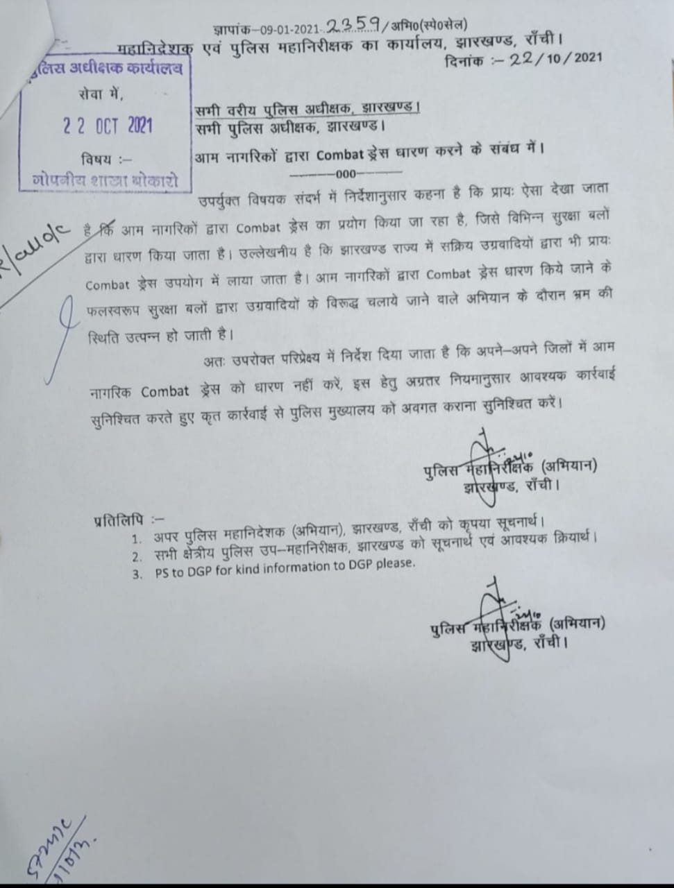 पुलिस महा निरीक्षक (अभियान) ने राज्य के सभी जिला के SSP और SP को पत्र निर्गत करते हुए कहा है कि विभिन्न सुरक्षाबलों के द्वारा COMBAT ड्रेस प्रयोग किया जाता है। राज्य में नक्सली भी COMBAT ड्रेस पहन रहे हैं। साथ ही आम नागरिक भी COMBAT ड्रेस पहनने लगे हैं। नक्सलियों के विरुद्ध अभियान चला रहे सुरक्षाबलों को इससे खासा परेशानियों का सामना करना पड़ रहा है। पुलिस महानिरीक्षक (अभियान) ने पत्र में कहा है कि COMBAT ड्रेस धारण करने वाले लोगों के विरुद्ध कानूनी कार्रवाई की जाए।