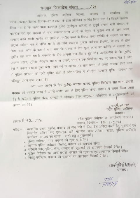 धनसार थाना क्षेत्र के माझेर पाड़ा कल्चरल यूनिट के बंग्ला भाषी संगठन के बुजुर्गों, पदाधिकारियों ने थाना प्रभारी पर अभद्र व्यवहार करने, गाली गलौज करने व मारपीट करने का आरोप लगाते हुए SSP को आवेदन दिया था। ASP मनोज स्वर्गियार ने पूरे मामले की जांच कर SSP को रिपोर्ट सौंप दिया। जांच रिपोर्ट के आधार पर SSP संजीव कुमार ने धनसार थाना प्रभारी सह इंस्पेक्टर जयराम प्रसाद को लाइन हाजिर कर दिया।