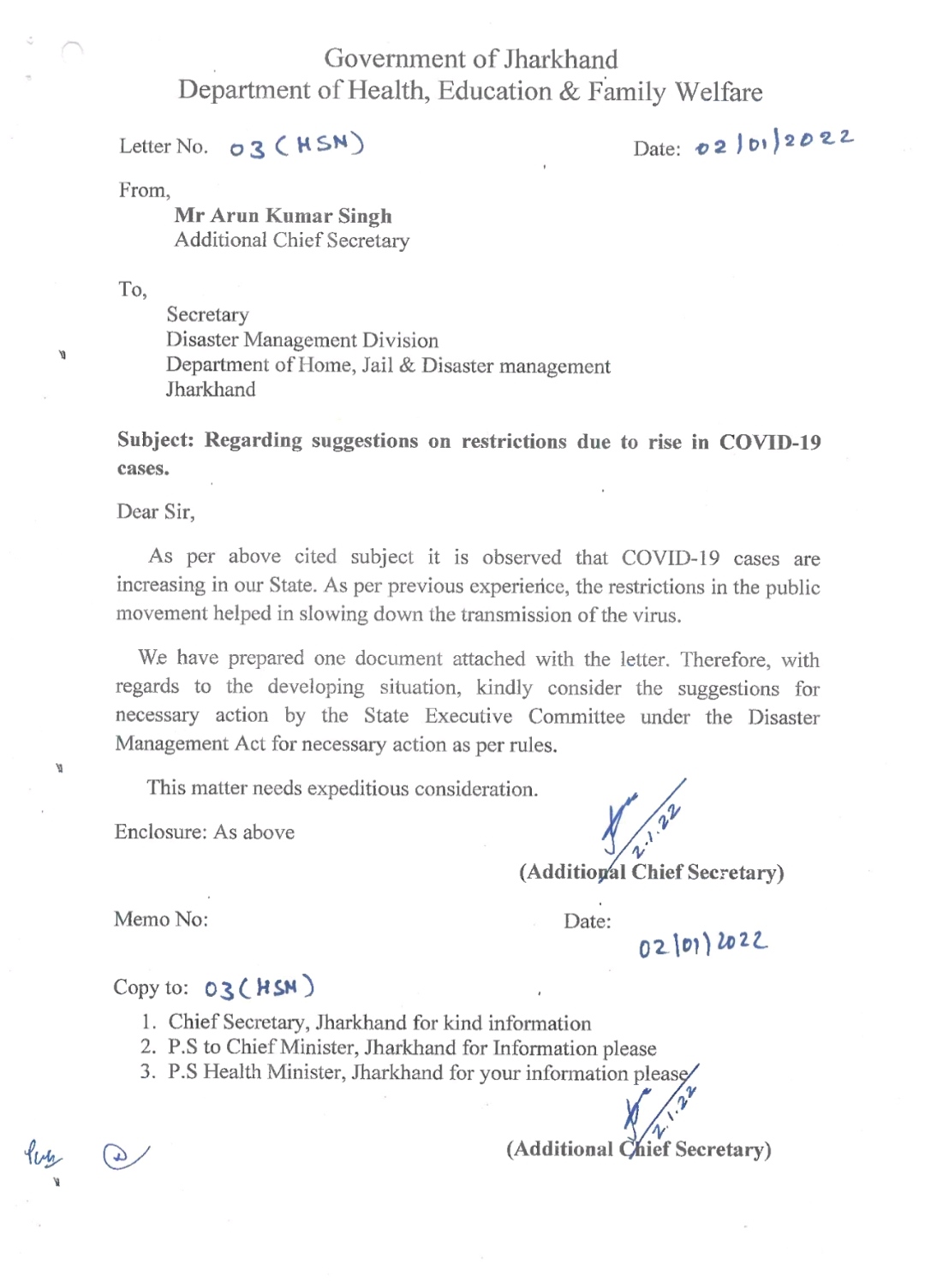 AJ डेस्क: झारखण्ड में तेजी से बढ़ रहे कोरोना संक्रमितों की संख्या को सूबे की सरकार ने गम्भीरता से लिया है। राज्य में कुछ कड़े कदम उठाकर कोरोना को नियंत्रित करने का मूड सरकार बना रही है। एडिशनल चीफ सेक्रटरी अरुण कुमार सिंह ने इस आशय का सिफारिश आपदा प्रबंध विभाग के पास भेजा है।