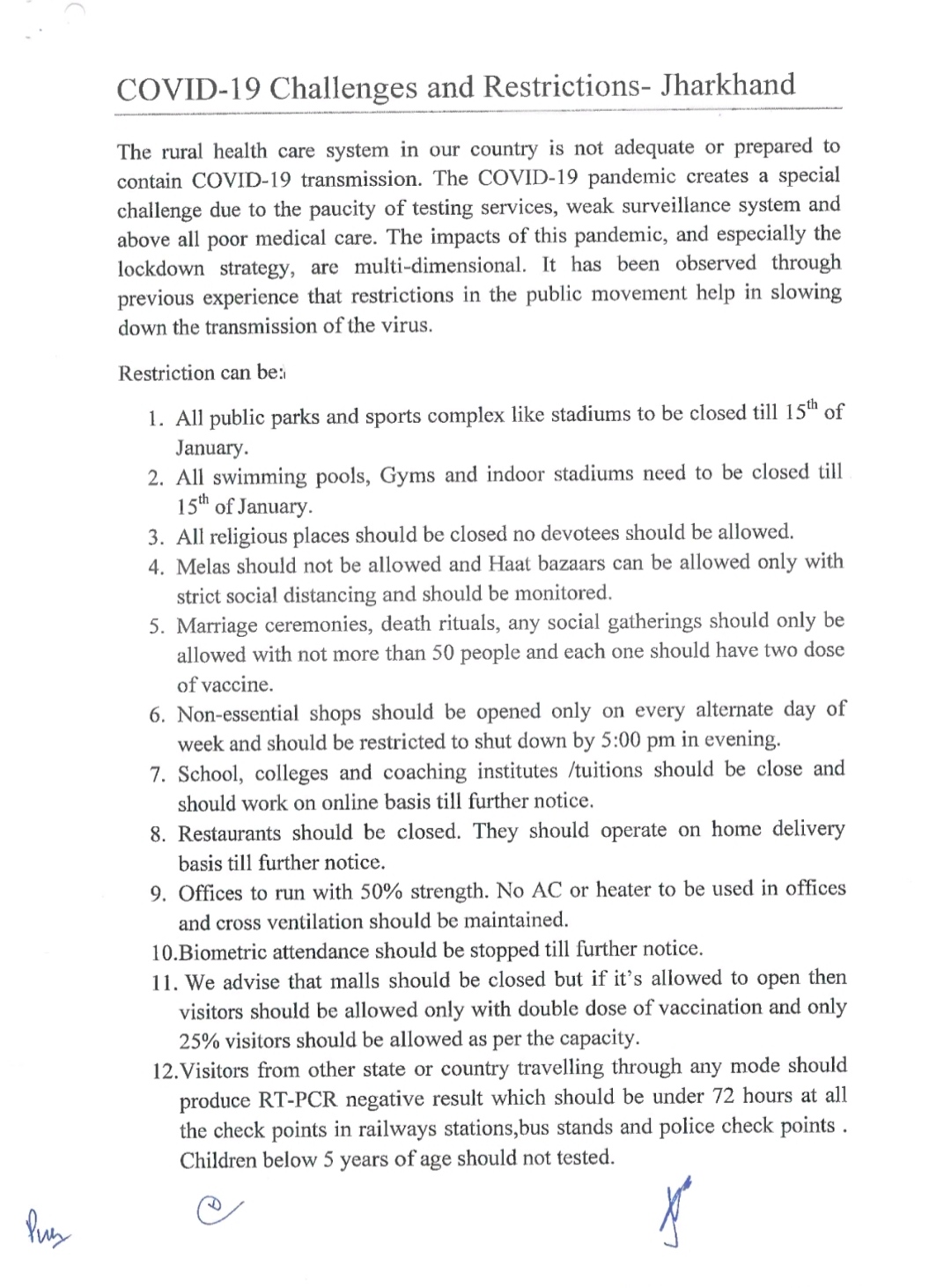 सिफारिश पत्र में कहा गया है कि 15 जनवरी तक संध्या 6 बजे से सुबह के 6 बजे तक कर्फ्यू लगाने पर विचार किया जाए।स्कूल, कॉलेज, शिक्षण संस्थान, कोचिंग को बन्द कराया जाए। स्विमिंग पुल भी बन्द करने की बात कही गयी है।