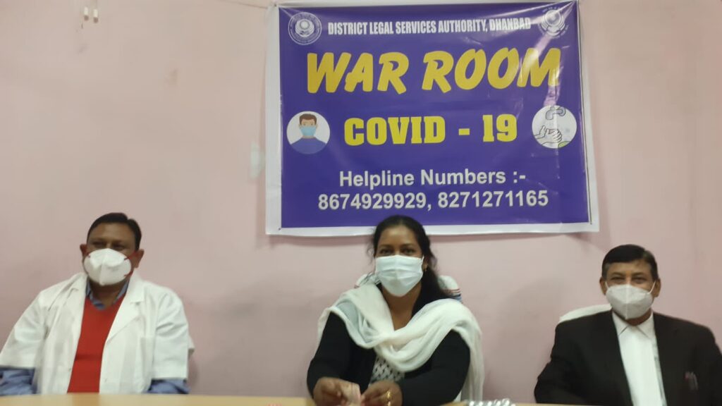 वार रूम का उद्घाटन करते हुए जिला एवं सत्र न्यायाधीश सह चेयरमैन डालसा राम शर्मा ने कहा कि झारखंड राज्य विधिक सेवा प्राधिकार (झालसा) के निर्देश पर धनबाद में जिला विधिक सेवा प्राधिकार (डालसा) ने जिला प्रशासन के साथ मिलकर एक वार रूम का गठन किया है। इसमें जिले के सिविल सर्जन द्वारा नामित डॉक्टर, पैरा लीगल वॉलेंटियर, रिटेनर अधिवक्ता और पैरामेडिकल स्टाफ आवश्यक दवाओं और ऑक्सीमीटर के साथ मौजूद रहेंगे। वार रूम में मौजूद चिकित्सक टेलीमेडिसिन सर्विस देंगे और दवा लिखेंगे। डालसा जरूरतमंदों को जिला प्रशासन के सहयोग से दवा उपलब्ध कराएगा। उन्होंने कहा कोविड से संक्रमित गंभीर मरीजों को बेड, ऑक्सीजन, दवा आदि उपलब्ध कराने में भी वार रूम जिला प्रशासन के सहयोग से मरीजों की सहायता करेगा। इसके लिए वार रूम का नंबर भी जारी किया गया है। वार रूम सुबह 8:00 बजे से रात्रि 10:00 बजे तक कार्य करेगा।