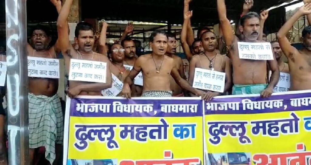 बाघमारा प्रखंड के अनेकों गांव के ग्रामीण अर्धनग्न प्रदर्शन में शामिल थे। प्रदर्शन कर रहे ग्रामीणों का आरोप है कि विधायक ढुल्लू महतो दबंगई करते हुए रैयतों की जमीन हड़प रहे हैं जबकि ग्रामीणों के पास न सिर्फ जमीन का कागज है बल्कि रसीद भी है। विधायक रैयती जमीन हड़प ही रहा है। सरकारी रास्ता भी कब्जा कर रहा है। इस हाल में ग्रामीण अपने घरों में कैद हो जाएंगे।