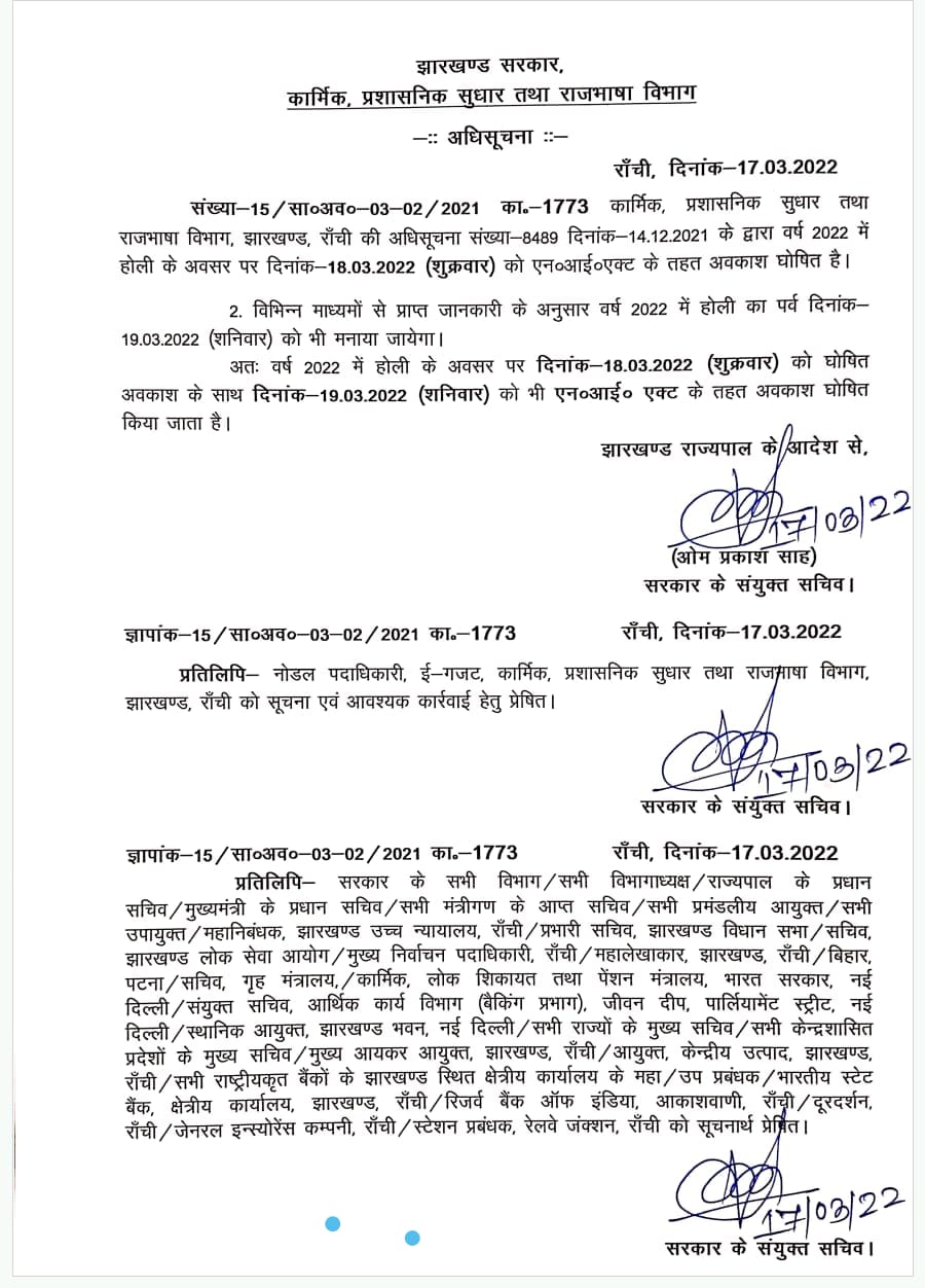 झारखंड में 18 और 19 मार्च को होली की छुट्टी