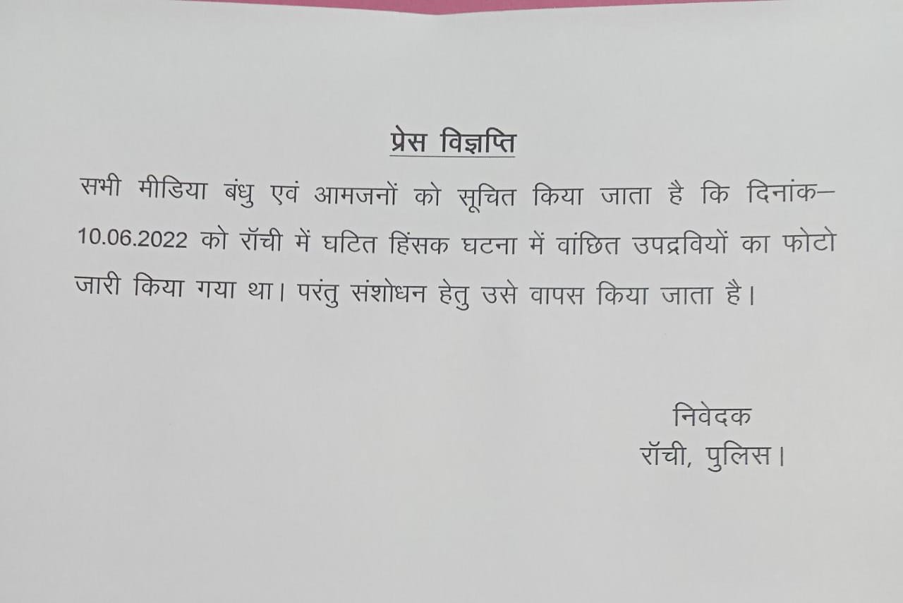 AJ डेस्क: रांची पुलिस के द्वारा आज अपराह्न शहर के कई क्षेत्रों में दस जून के उपद्रव में शामिल उपद्रवियों का बैनर पोस्टर लगाया गया था। फिर चंद घंटे के बाद ही पुलिस के द्वारा उक्त बैनर पोस्टर हटा लिया गया। रांची पुलिस ने एक बयान जारी करते हुए कहा है कि “संशोधन” के लिए बैनर पोस्टर वापस लिया जाता है।