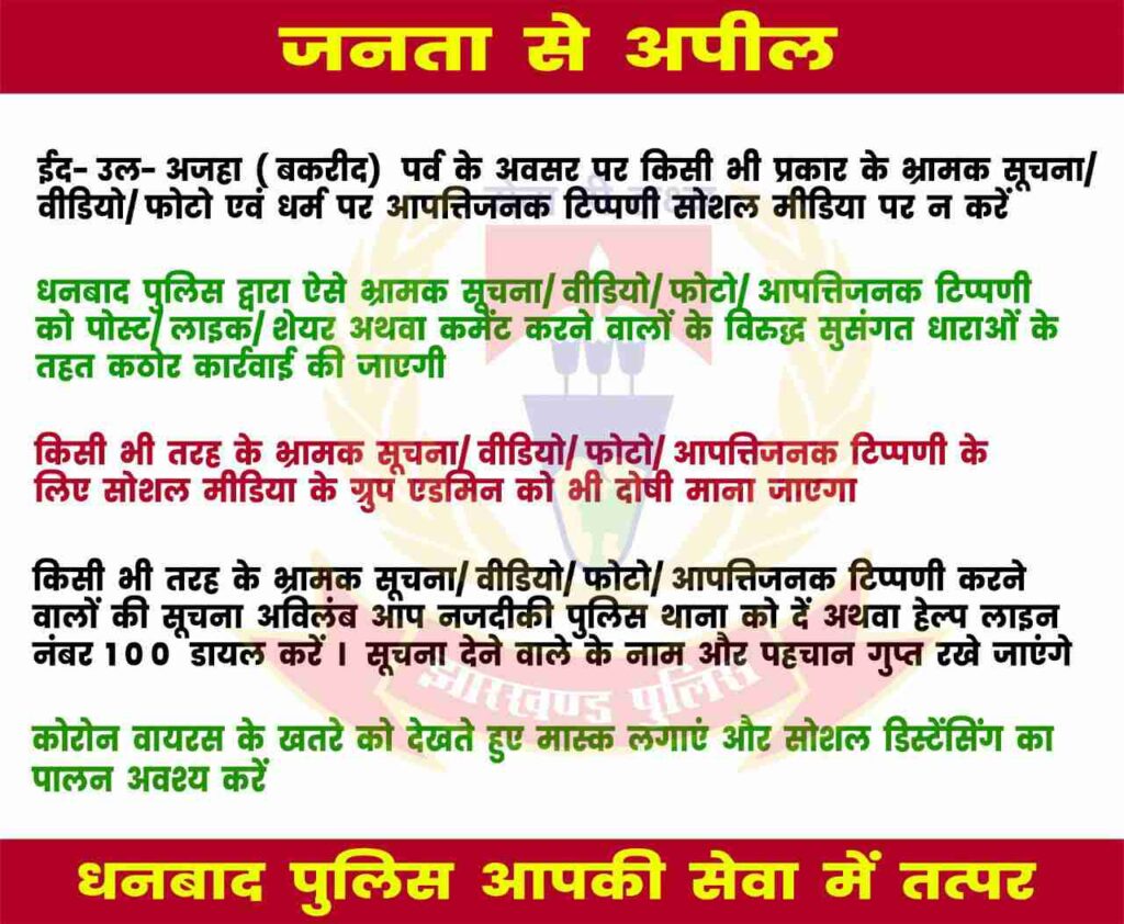 AJ डेस्क: बकरीद पर्व के अवसर पर सोशल मीडिया में भ्रामक सूचना, वीडियो, फोटो एवम धर्म पर आपत्तिजनक टिपण्णी नही करने की अपील धनबाद पुलिस ने किया है।