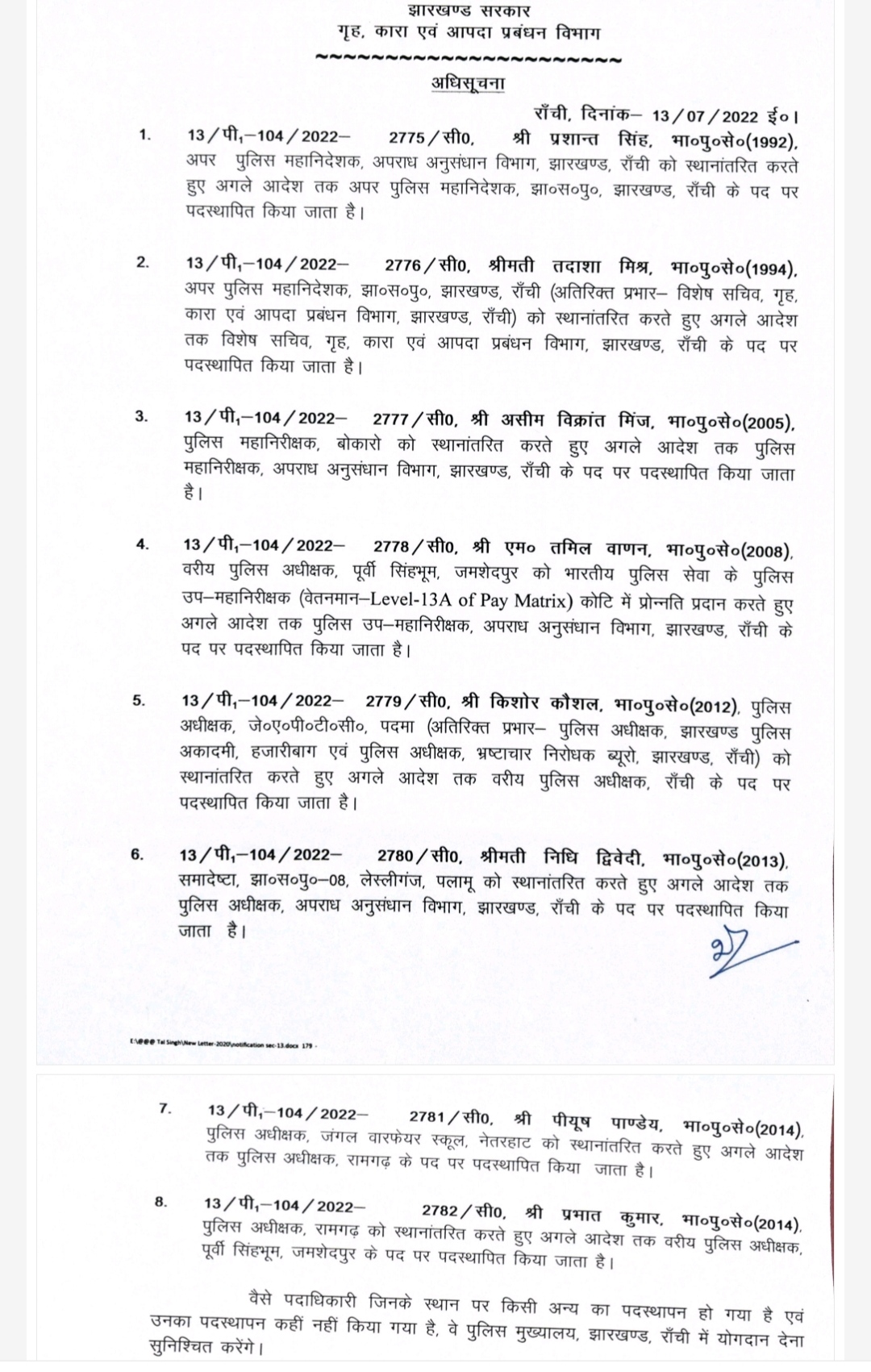 BREAKING NEWS झारखंड रांची और जमशेदपुर के SSP बदले गए, IG असीम विक्रांत मिंज का भी हुआ तबादला 3 years ago Analjyoti AJ डेस्क: राज्य सरकार ने आठ आईपीएस अधिकारियों का तबादला किया है। रांची के एसएसपी सुरेन्द्र कुमार झा को वहां से हटाते हुए कौशल किशोर को रांची का एसएसपी बनाया गया है। विस्तृत जानकारी के लिए लिस्ट देखें —– Continue Reading Previous {VIDEO} उफनती गंगा नदी को “महावत” संग “गजराज” ने पार किया, खूब हो रही चर्चाNext सावन मास शुरू होते ही बाबा बैद्यनाथ के दरबार में उमड़ी श्रद्धालुओं की भीड़ Leave a Reply Cancel replyYour email address will not be published. Required fields are marked *Comment Name * Email * Website