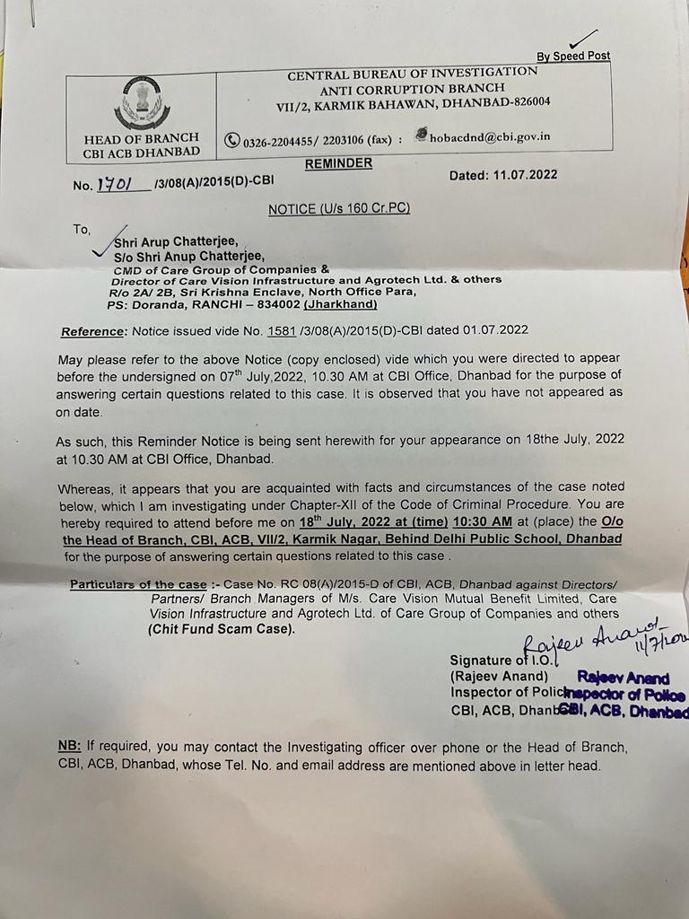 धनबाद CBI ने अरूप चटर्जी को एक पत्र भेजते हुए कहा है कि केयर विजन म्यूचुअल बेनिफिट लिमिटेड, केयर विजन इंफ्रास्ट्रक्चर एंड एग्रोटेक लिमिटेड, केयर ग्रुप ऑफ कंपनीज मामले में उनसे कुछ सवालों का जवाब चाहिए। इसके लिए अरूप चटर्जी को पहले सात जुलाई को CBI ऑफिस में आने के लिए पत्र दिया गया था लेकिन वह नहीं पहुंचे। सीबीआई ने पुनः एक नोटिस जारी करते हुए 18 जुलाई को अरूप चटर्जी को तलब किया था।
