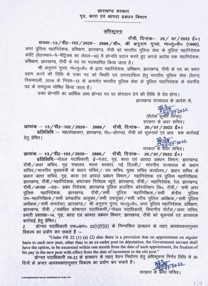 AJ डेस्क: गृह, कारा एवम आपदा प्रबंधन विभाग ने एक अधिसूचना जारी करते हुए कहा है कि 1990 बैच के आईपीएस अनुराग गुप्ता को अपर पुलिस महा निदेशक से पुलिस महा निदेशक कोटि में प्रोन्नति प्रदान किया जाता है। श्री गुप्ता अगले आदेश तक महा निदेशक, प्रशिक्षण की जिम्मेवारी संभालेंगे।