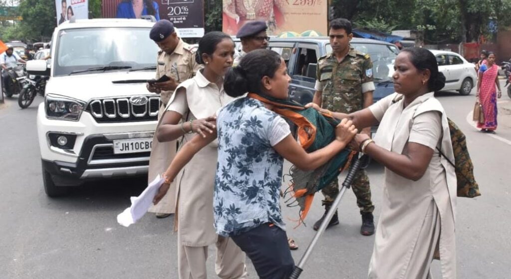 इसके बाद युवती ने बैनर फाड़े जाने और न्याय की मांग की गुहार लगाते हुए सड़क के बीचो बीच ही धरने पर बैठ गई। जिसके बाद झारखंड पुलिस की महिला जवानों ने बल प्रयोग करते हुए उसे सड़क से उठाकर फेंक दिया। पुलिस द्वारा लड़की के साथ हुई धक्का मुक्की के दौरान युवती सड़क पर सिर के बल गिर पड़ी। जिससे उसके सिर के पिछले हिस्से में चोट लग गई। जिससे युवती वहीं बेहोश हो गई। लेकिन महिला पुलिस कर्मियों का दिल नहीं पिघला। उन्होंने बेहोश युवती को जानवर की भांति उठाकर वहीं पास के धरना स्थल के एक हिस्से में लिटा कर गायब हो गई।