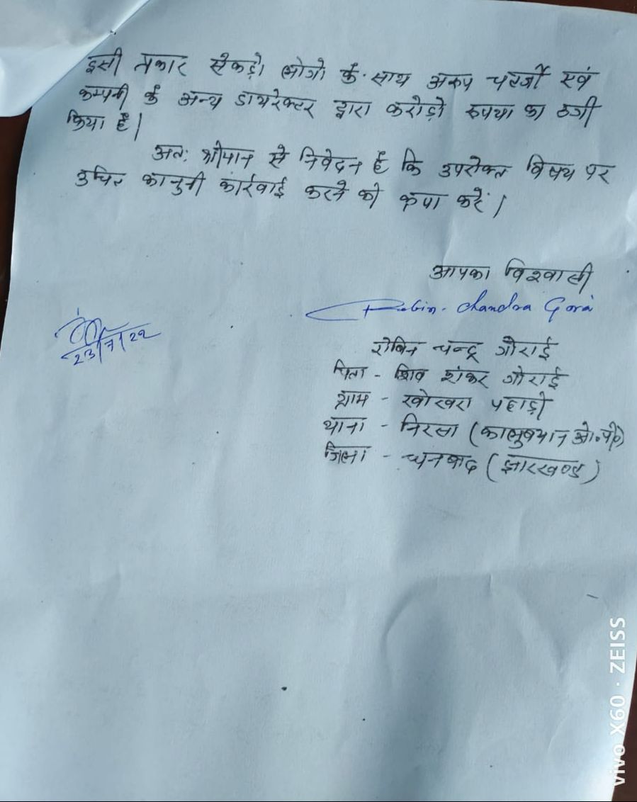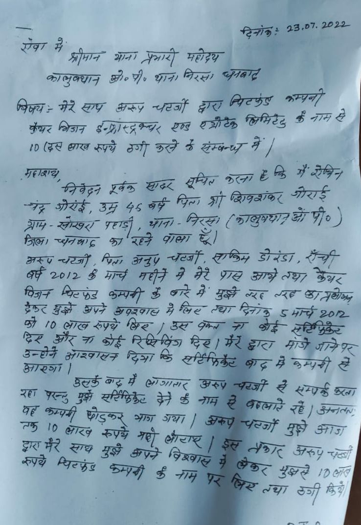 केयर विजन कंपनी के ठगी के शिकार रोबिन गोराई ने लिखित शिकायत में कहा है कि अरूप चटर्जी ने उससे दस लाख रुपए लिए और निवेश का सर्टिफिकेट तक नहीं दिया। अरूप की ओर से सिर्फ आश्वासन पर आश्वासन मिलता रहा और अंत में कंपनी धनबाद से बोडिया बिस्तर समेट कर फरार हो गया। श्री गोराई की शिकायत है कि उसे अब तक केयर विजन से फूटा कोड़ी नही मिला है। श्री गोराई के आवेदन पर तहकीकात करने के पश्चात पुलिस ने केस दर्ज करते हुए जांच शुरू कर दिया है।