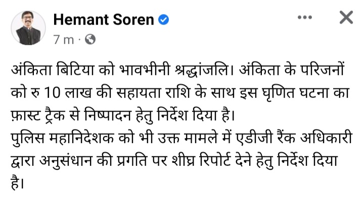 AJ डेस्क: सीएम हेमंत सोरेन ने अंकिता के निधन पर श्रद्धांजलि दी है। इसके अलावा उन्होंने 10 लाख रुपये के मुआवजे का एलान किया है। साथ ही सीएम ने कहा है कि DGP को भी इस मामले में रिपोर्ट देने के लिए कहा गया है।