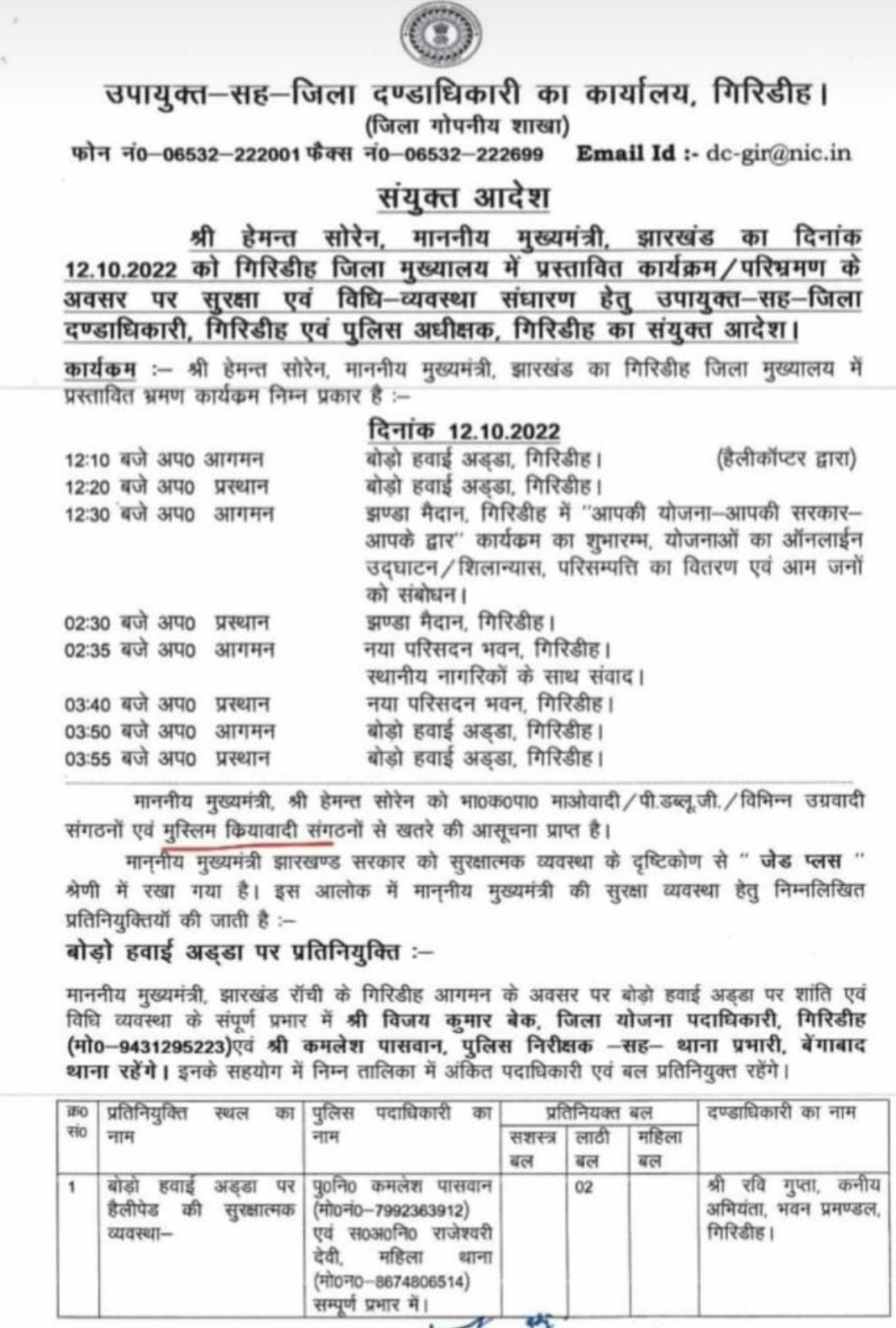 गिरिडीह जिला प्रशासन की ओर से जारी निर्देश में यह उल्लेख किया गया है कि मुख्यमंत्री हेमंत सोरेन को मुस्लिम क्रियावादी संगठनों से खतरा है। जिला प्रशासन की ओर से अफसरों को सीएम की सुरक्षा के लिए निर्देश दिया गया है। जारी निर्देश के अनुसार, हेमंत सोरेन को मुस्लिम क्रियावादी संगठनों के अलावा विभिन्न नक्सली समूहों से भी खतरा बताया गया है।