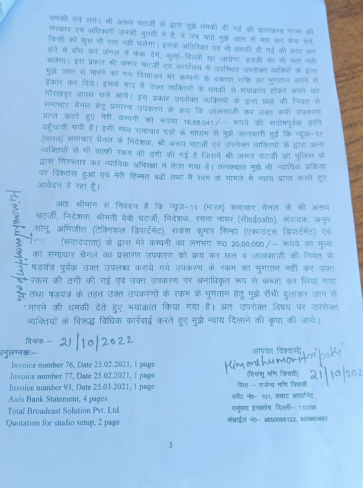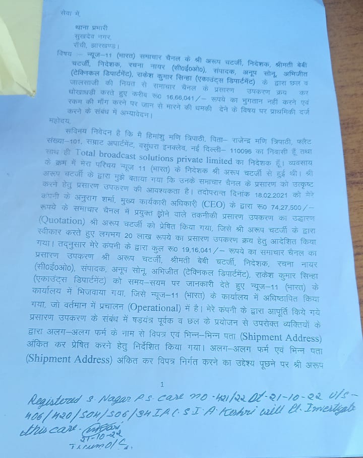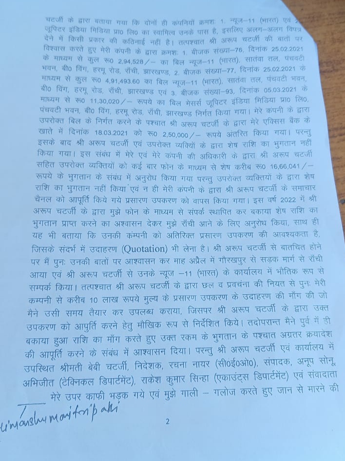 नई दिल्ली के हिमांशु मणि त्रिपाठी ने रांची के सुखदेव नगर थाना में FIR दर्ज कराते हुए कहा है कि अरूप चटर्जी ने वर्ष 2021 में उनकी कंपनी से न्यूज 11 और जुपिटर इंडिया प्राइवेट लिमिटेड के नाम से अलग अलग एड्रेस पर चैनल में प्रसारण के उपकरण मंगवाया था। इस मद में सोलह लाख रुपए का भुगतान अरूप चटर्जी को करना था, जो उसने नही किया।