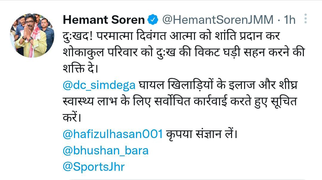 इधर विधायक ने मृतक छात्र के परिजनों से मिलकर उन्हें ढांढस बंधाया। साथ ही इस दुःख की घड़ी में उनके साथ खड़ा रहने का आश्वासन दिया। इस घटना पर सीएम हेमंत सोरेन ने संज्ञान लेते हुए घायल खिलाड़ियों के बेहतर इलाज की व्यवस्था सुनिश्चित करने का निर्देश दिया है। साथ मृतक के प्रति दुःख प्रकट किया है।