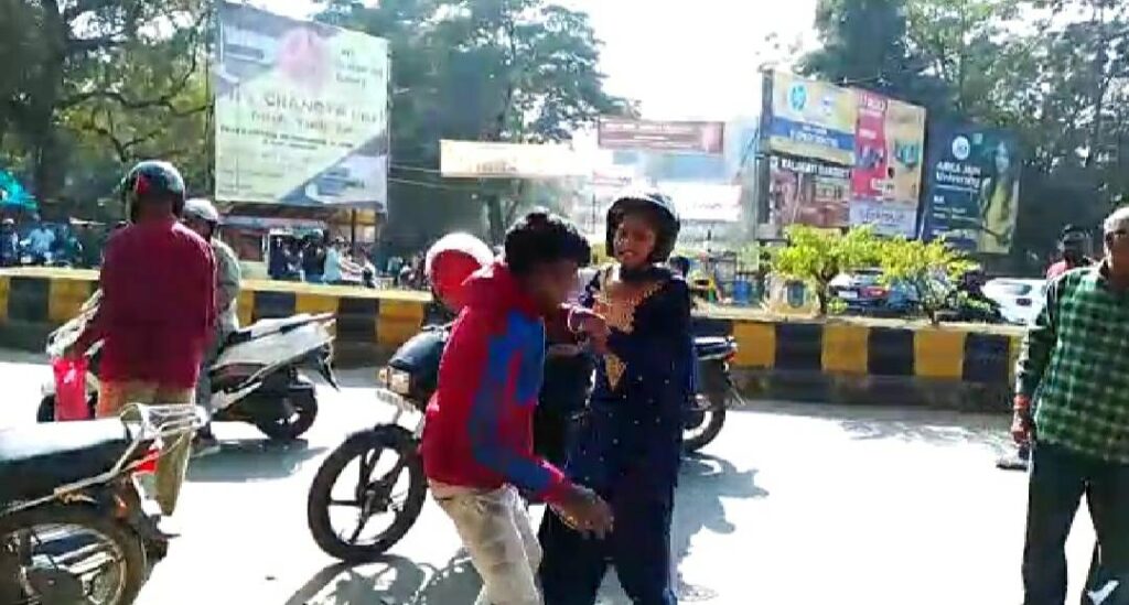 AJ डेस्क: लगभग 17 लाख की आबादी वाला शहर जमशेदपुर की सड़को पर प्रति दिन लाखों बाइक दौड़ती है। इस दौरान कई सड़क दुर्घटनाए भी देखने को मिलती है। लेकिन आज जुबली पार्क गेट के समीप जो वाक्य देखने को मिला उसे देख वहाँ मौजूद लोग भौचक्के रह गए। दरअसल पास से गुजर रहा एक युवक स्कूटी चला रही एक युवती के स्कूटी से टच कर गया। जिसपर तमतमाई स्कूटी चला रही युवती ने अपनी सहेली का हेलमेट लेकर उस युवक पर बरस पड़ी। युवक की पिटाई कर रही युवती का कहना था कि यदि युवक द्वारा मेरे स्कूटी में टच करने पर कही हम गिर जाते तो, मर जाते तो, इत्यादि।