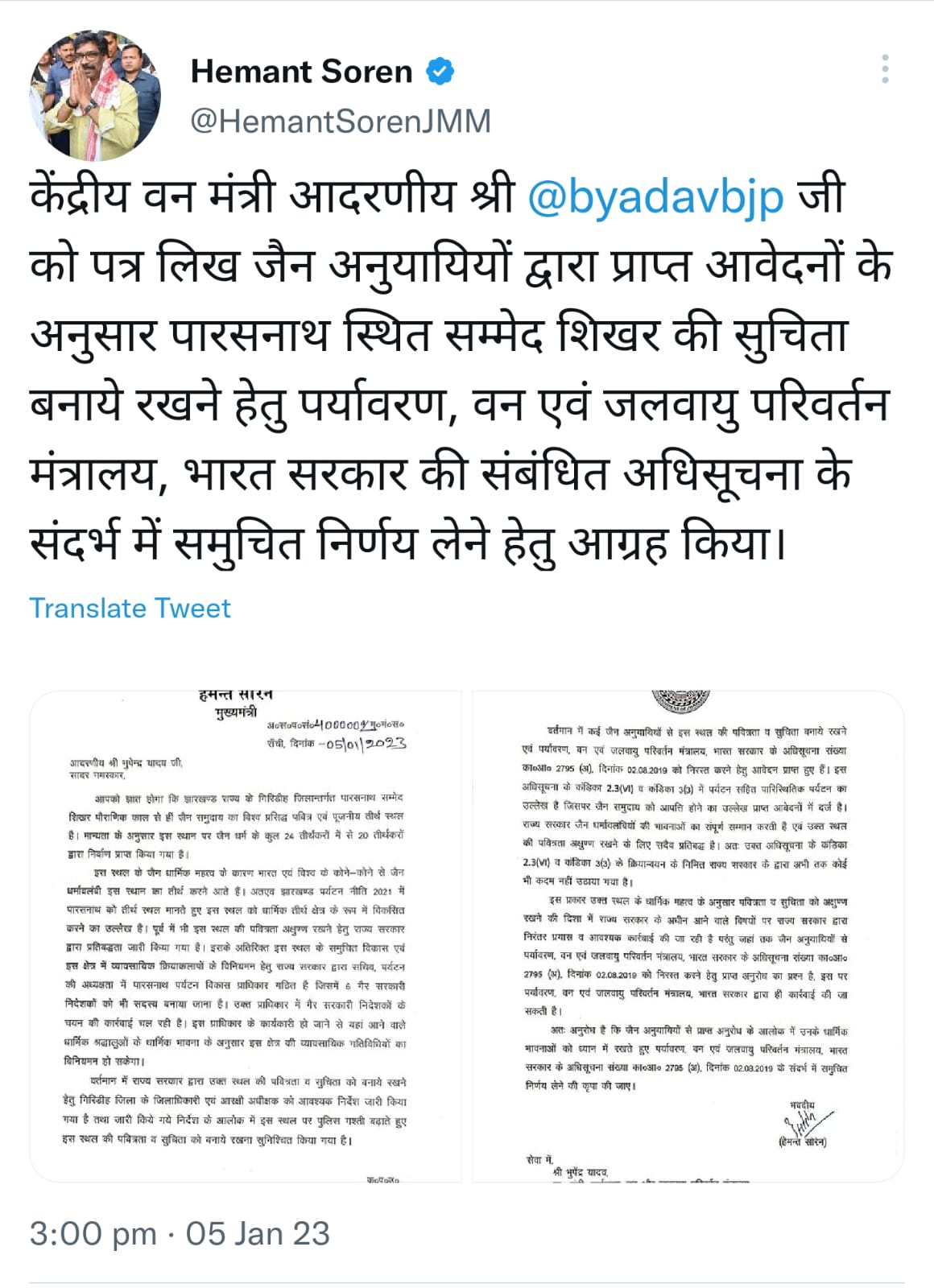 AJ डेस्क: मुख्यमंत्री हेमन्त सोरेन ने केंद्रीय मंत्री पर्यावरण, वन एवं जलवायु परिवर्तन विभाग भूपेंद्र यादव को पत्र लिख जैन अनुयायियों की धार्मिक भावनाओं को ध्यान में रखते हुए पर्यावरण, वन एवं जलवायु परिवर्तन मंत्रालय, भारत सरकार के अधिसूचना संख्या का०आ० 2795 (अ) दिनांक 02.08.2019 के संदर्भ में समुचित निर्णय लेने का आग्रह किया है।